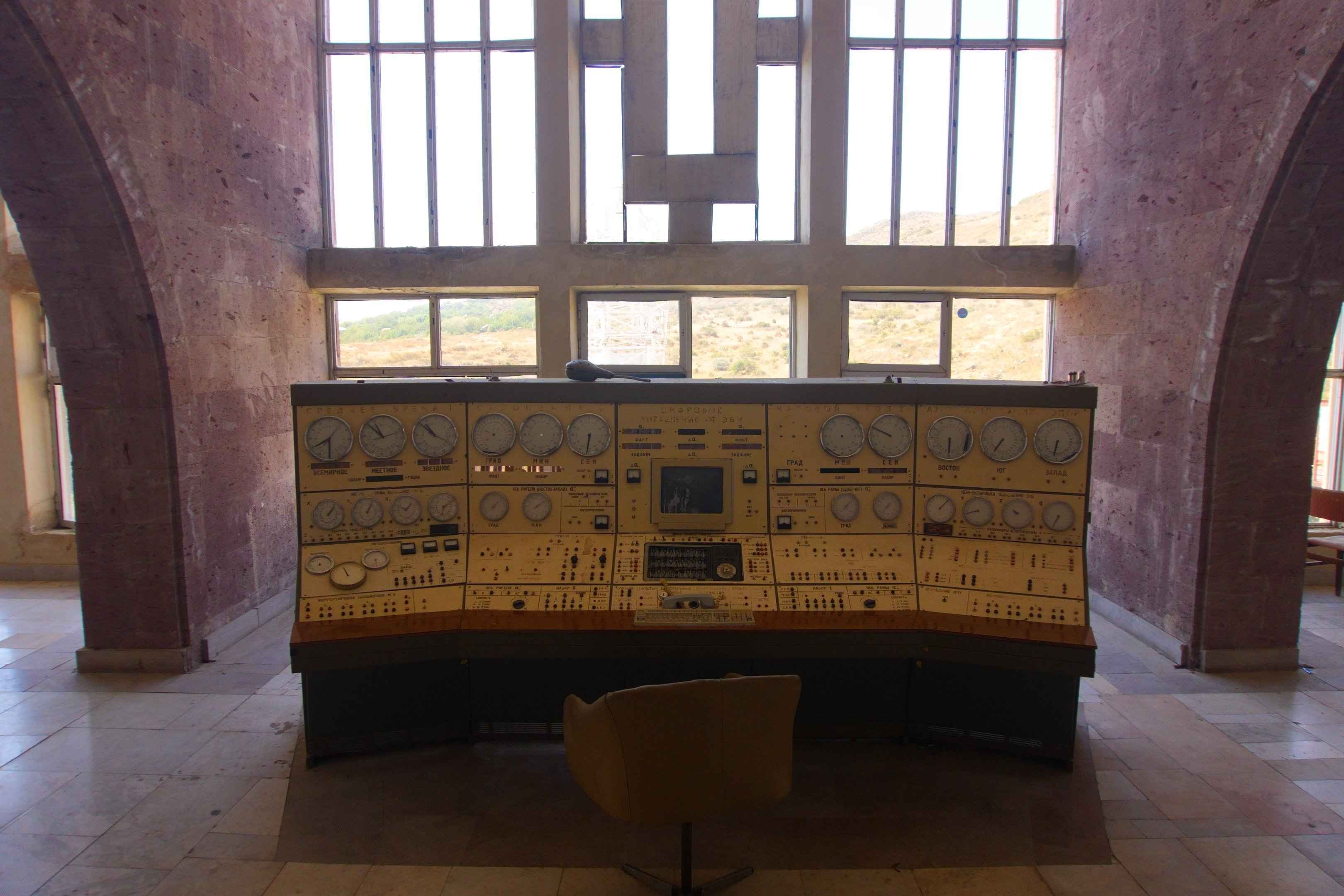Die Beschriftungen der Instrumente sind alle auf Kyrillisch. Einige Anzeigen zeigen Werte wie Grad, Minuten und Sekunden an – vermutlich konnten hierüber die genaue Ausrichtung des Teleskops und verschiedene Messparameter gesteuert werden.