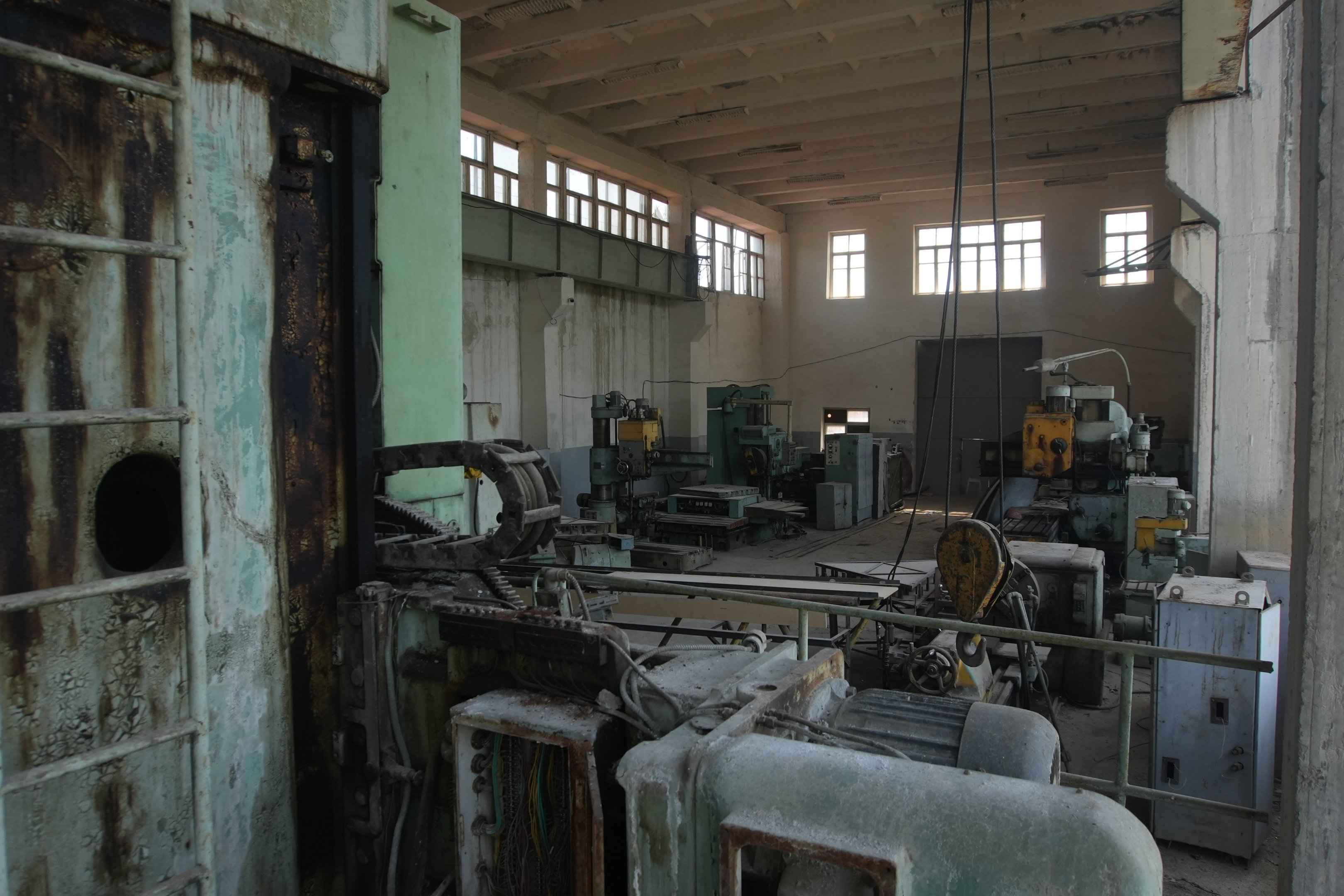 Ein Fenster im oberen Stockwerk war eingeschlagen. Ich kletterte außen an der Wand hinauf, um hineinsehen zu können. Im Inneren standen noch zahlreiche Maschinen: Pressen, Formmaschinen, Motoren und andere Geräte. Offenbar wurden hier damals Teile für die Anlage hergestellt oder repariert – vermutlich während des Baus und später für Wartungsarbeiten.
