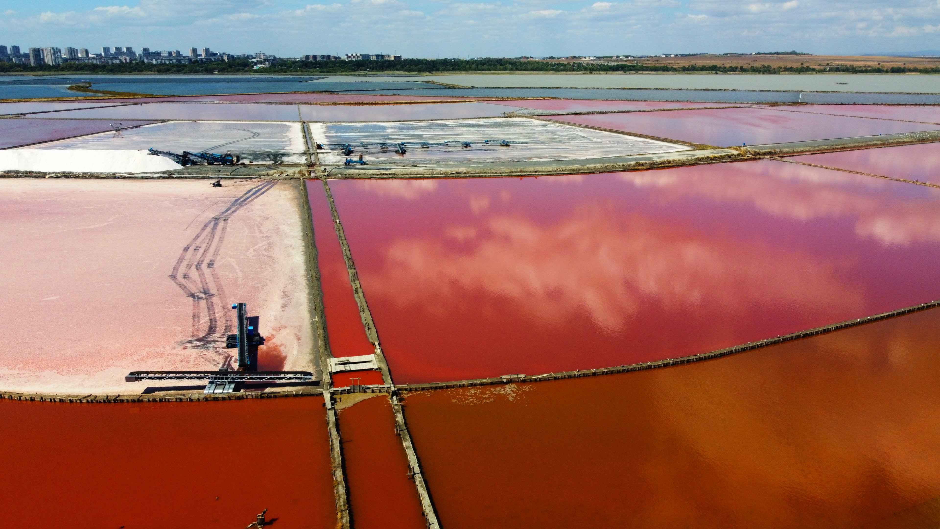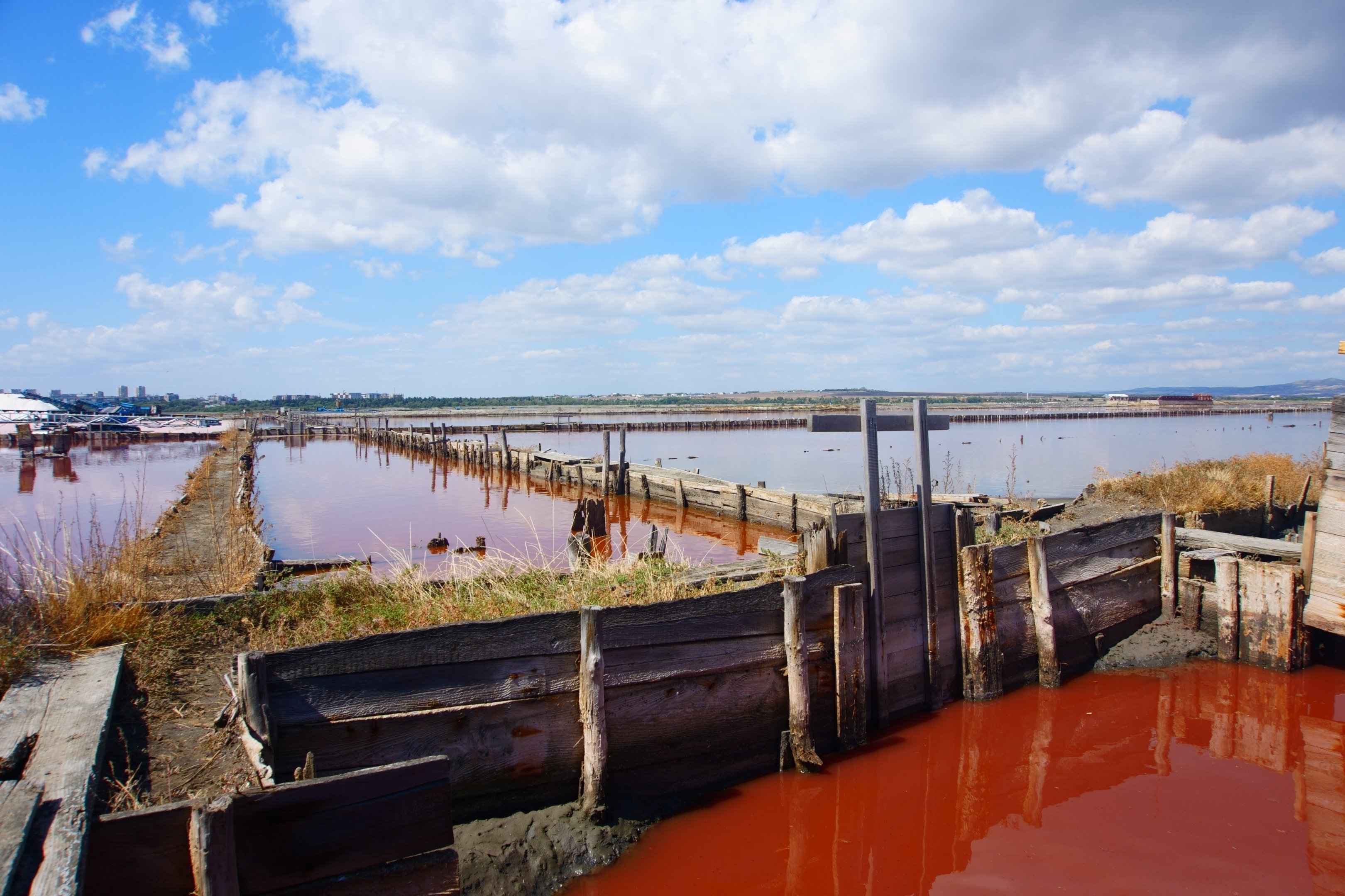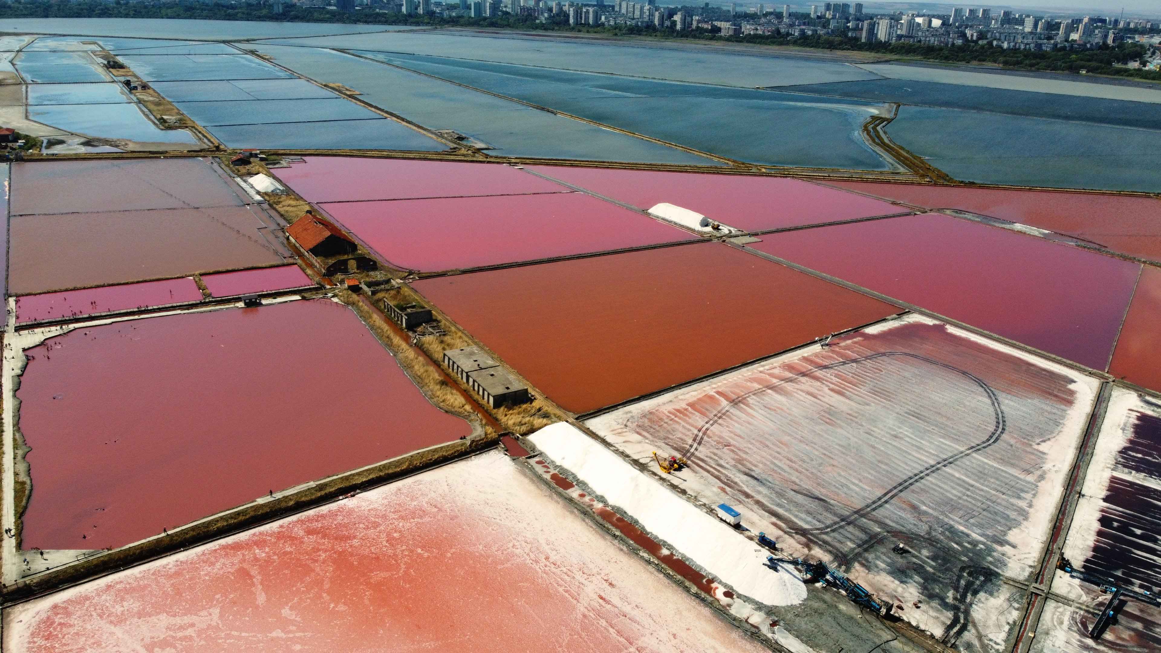 Die Salinen erstrecken sich am Atanassow-See. Die rosa und türkisfarbenen Becken entstehen durch Algen und Bakterien bei hohem Salzgehalt.