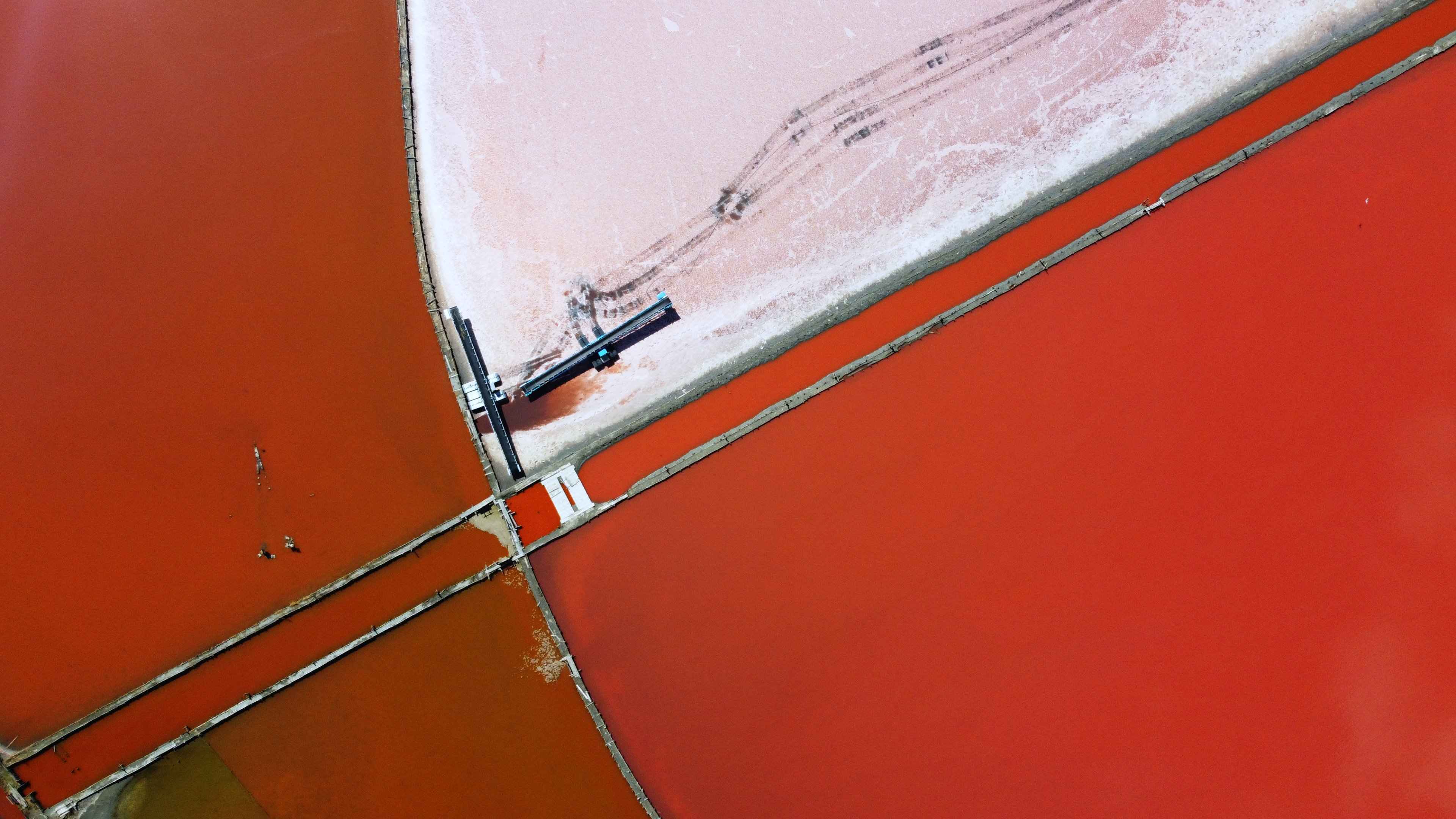 Bei dem Foto der Evaporationsbecken sieht man die Salinen von oben mit der Drohnenaufnahme. Links im Bild ist ein Förderbagger oder Förderband zu sehen, mit dem das Salz gefördert und abtransportiert wird. Die rötlichen Becken sind richtig knallrot – durch die Bakterien und das Salz. Die frisch befüllten Becken sind dagegen noch blau, weil das Wasser dort noch nicht so stark verdunstet ist.