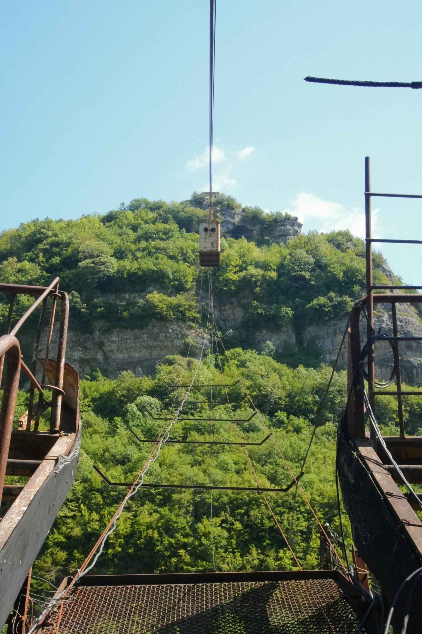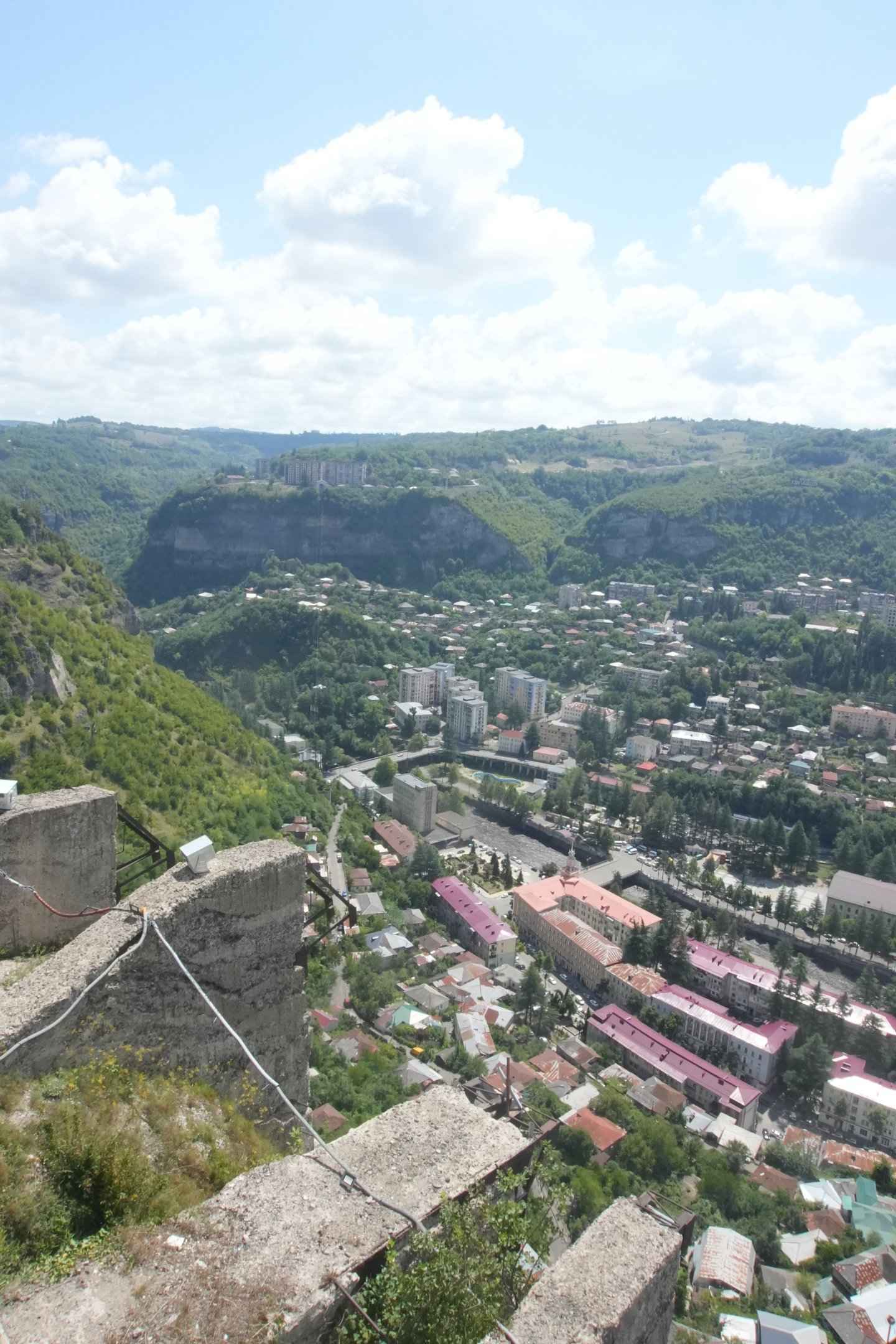 Von oben erkennt man die Lage der Stadt. Tschiatura liegt eingezwängt im Tal des Qwirila, die Seilbahnen verbinden die Höhenlagen mit dem Zentrum. Ohne sie wären viele Wege nur mühsam zu Fuß möglich. Von der Stalinbahn aus habe ich eine kleine Wanderung oben an der Klippe entlang gemacht. Dort gibt es noch mehrere alte Bergstationen von Seilbahnen, die aber verlassen sind.