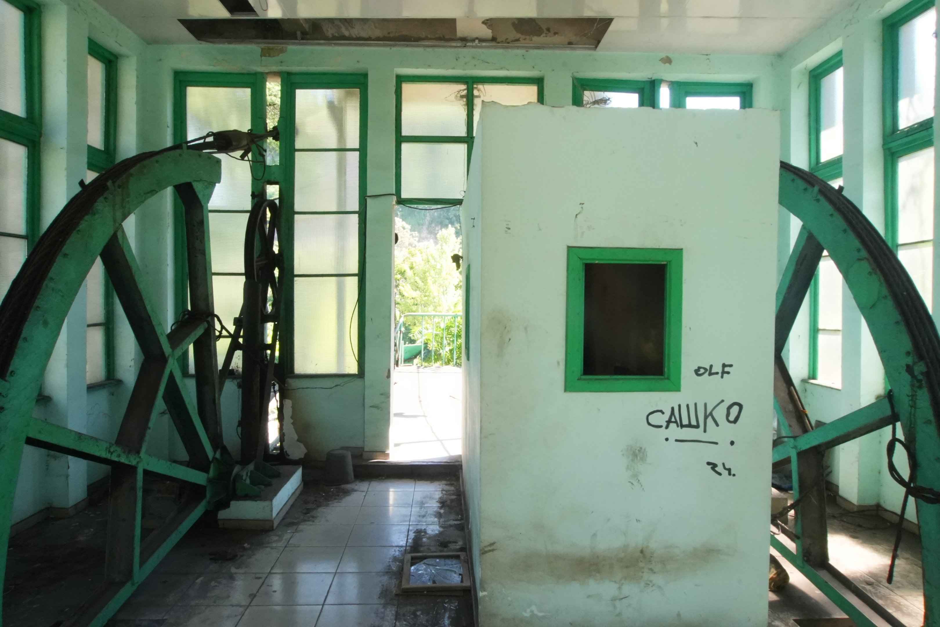 In einer Station von innen. Schalter, Seile, alte Beschriftungen. Hier wurde einst der Betrieb überwacht und die Gondeln bedient.