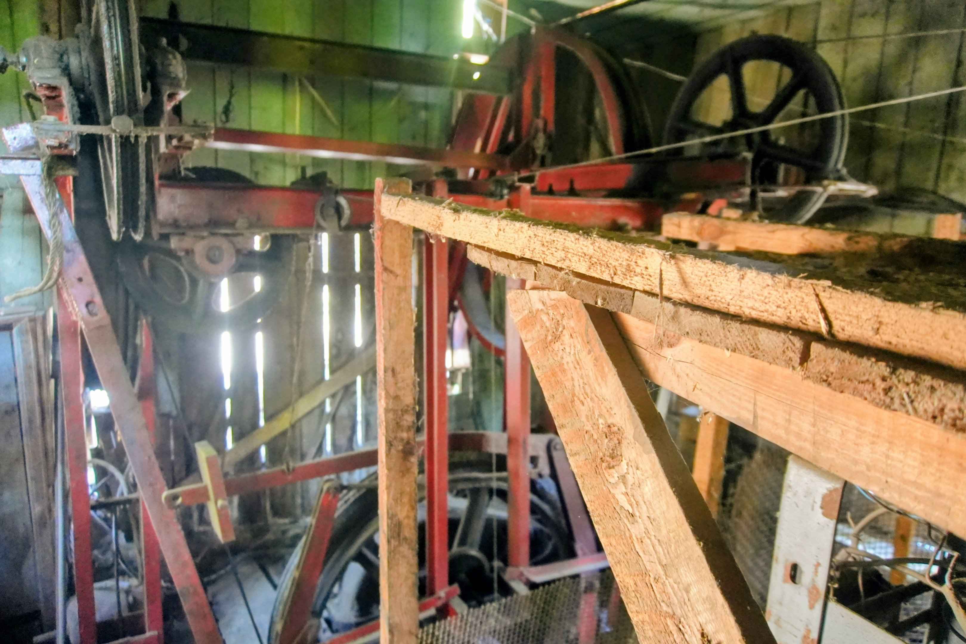 Im Maschinenraum der Tsofi-Station. Antriebe, Seilscheiben, Ölspuren.