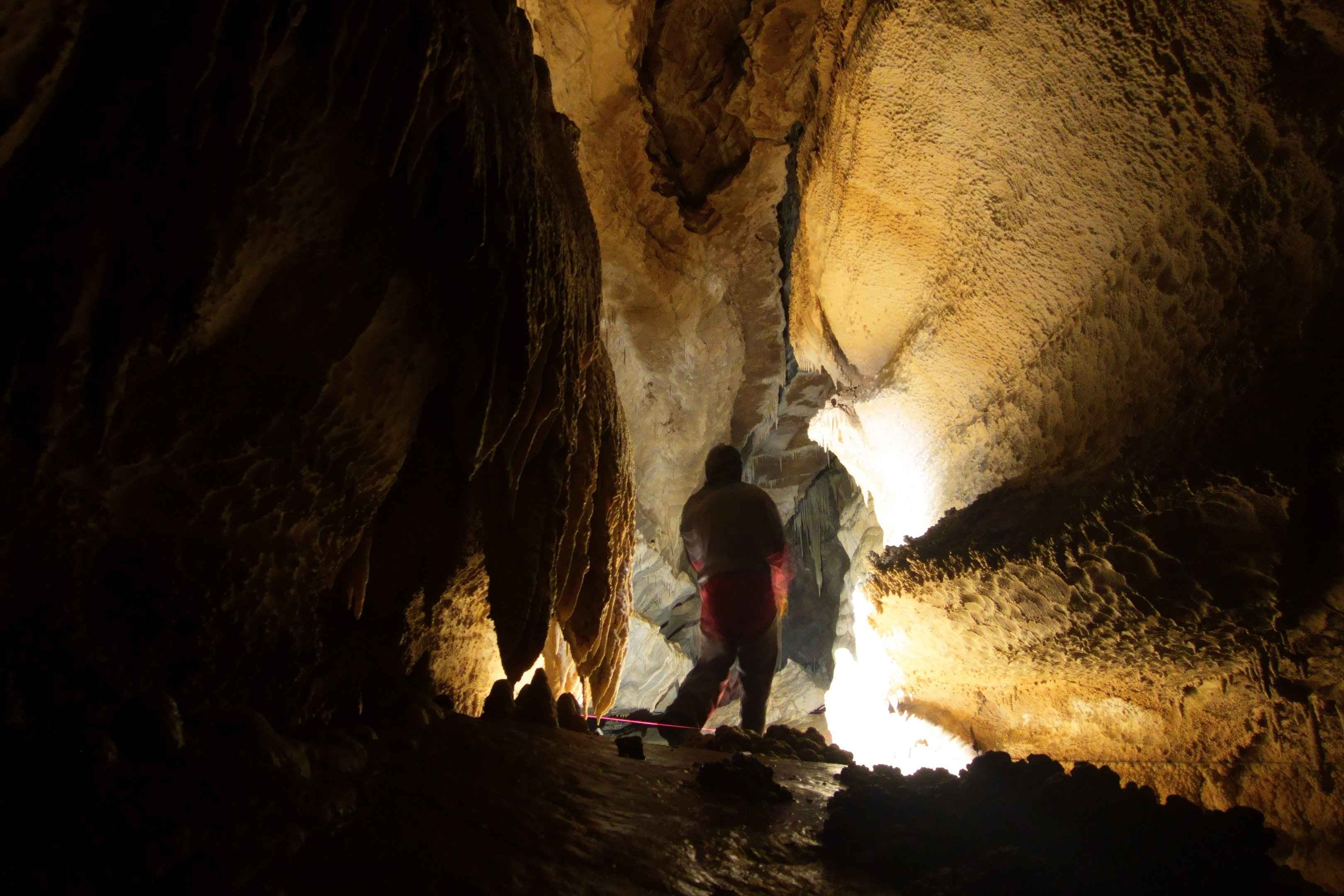 Die Höhle schlängelt sich durch einen Hauptgang hindurch. Man kann sich darin nicht wirklich verlaufen. Wir hatten eigene Taschenlampen mitgebracht. In der Höhle ist es stockdunkel. An den Wänden hängen noch die Schnüre von der Vermessung der Höhle.