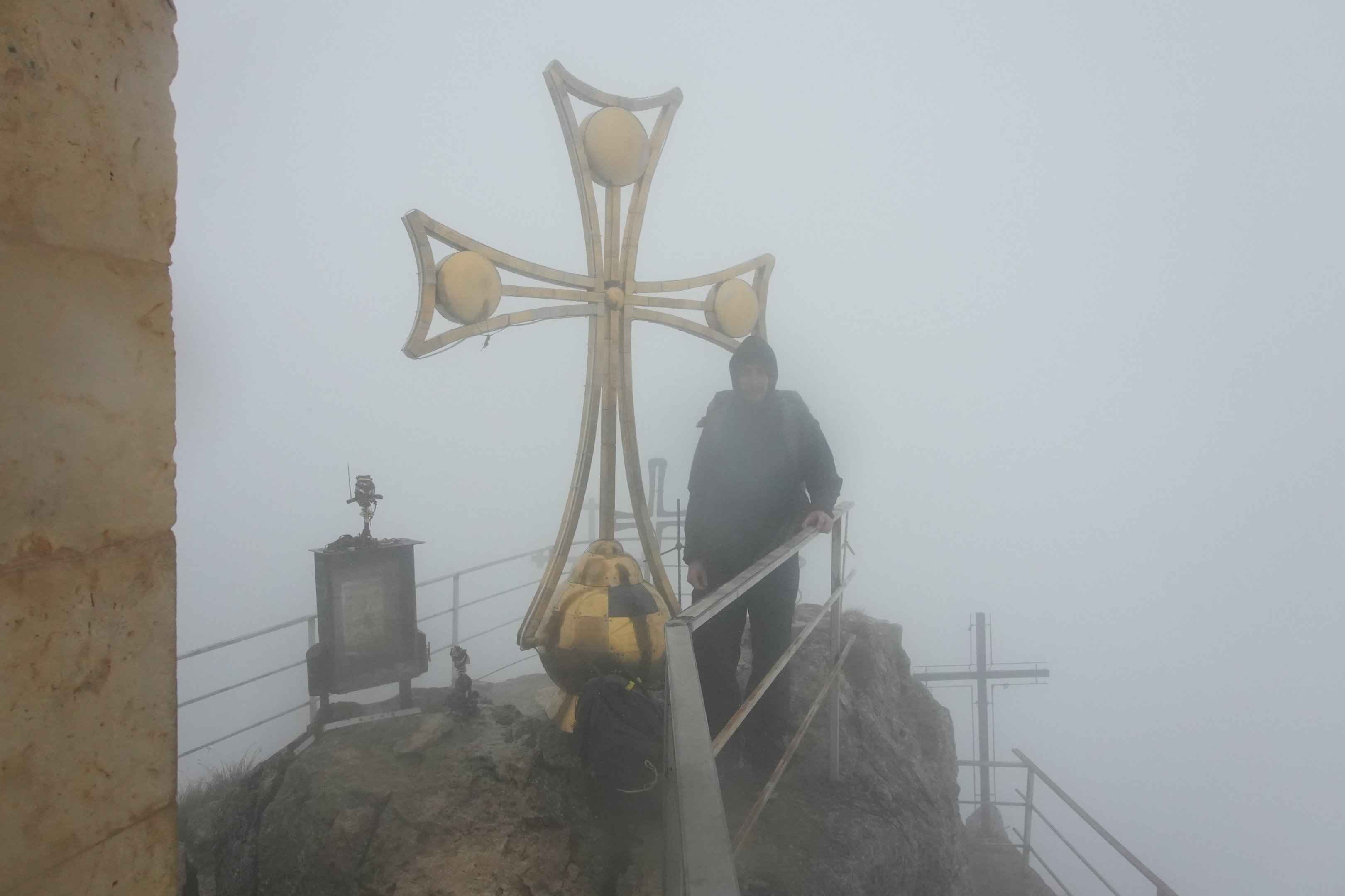 Nach der Höhle wanderten wir noch zum Gipfel von Tskhrajvari. Der Schrein der Neun Kreuze liegt auf etwa 1.500 bis 1.569 Metern Höhe, nahe dem Nakerala-Pass an der Grenze zwischen Imereti und Racha. Eine kleine Kapelle ist dem Heiligen Georg geweiht. Der Legende nach trug ein Vater neun Kreuze den Berg hinauf und errichtete den Schrein zu Ehren seiner neun Söhne, die in den Krieg gezogen waren. An klaren Tagen reicht der Blick bis zum Schwarzen Meer, über die kolchischen Tiefebenen und die schneebedeckten Gipfel des Kaukasus. An unserem Tag war es sehr regnerisch und nebelig, windig und kalt. Man sah gerade mal zehn Meter weit.