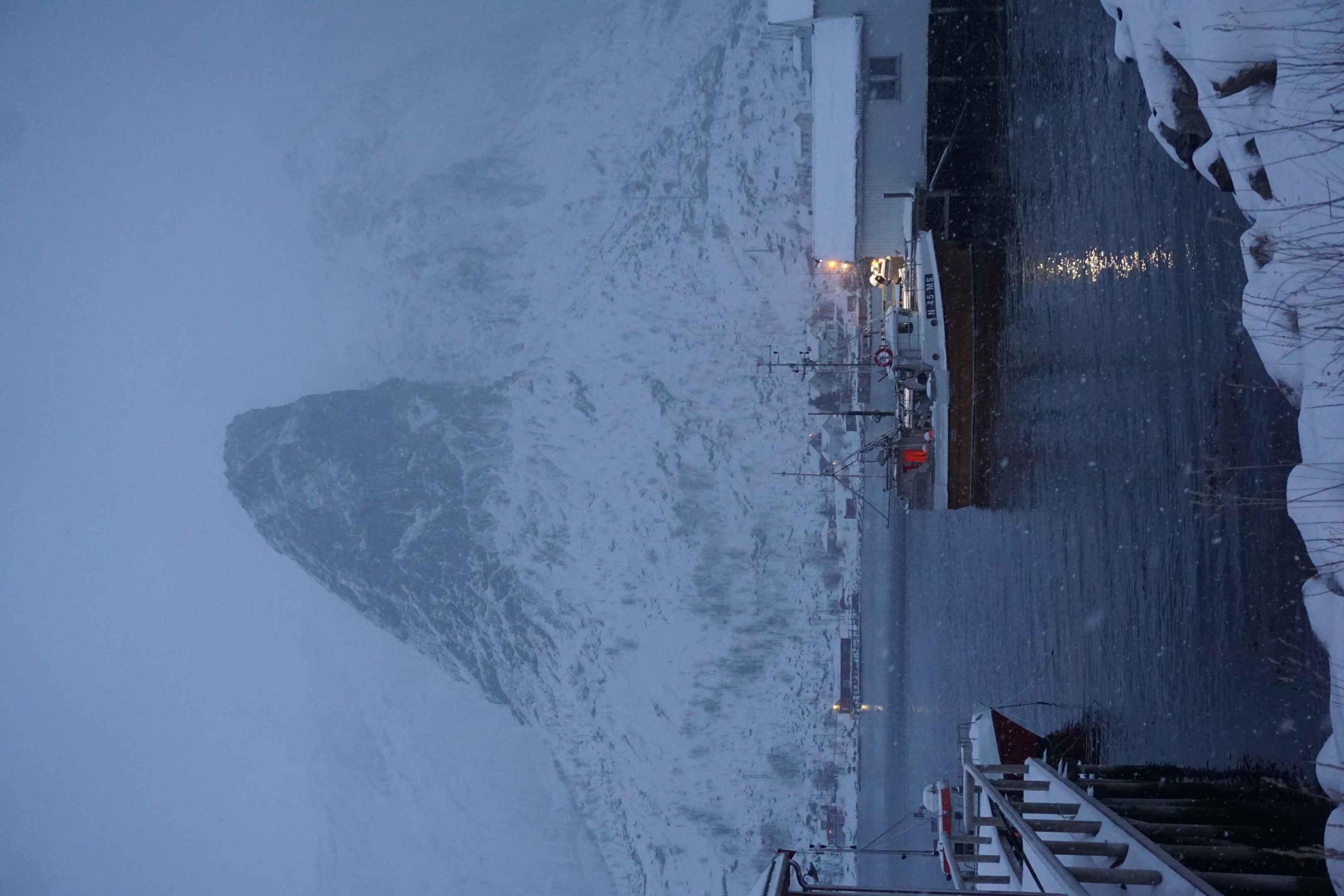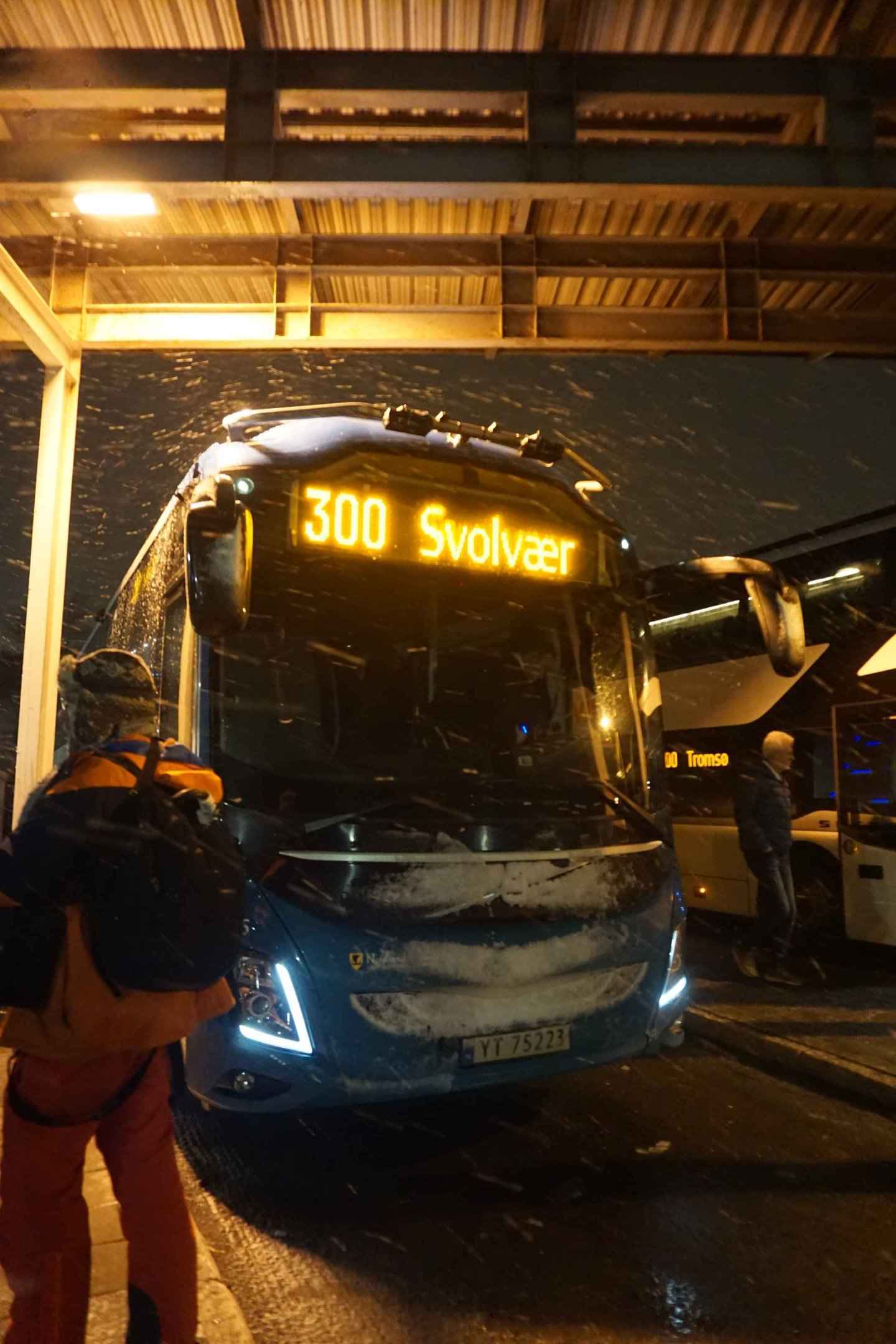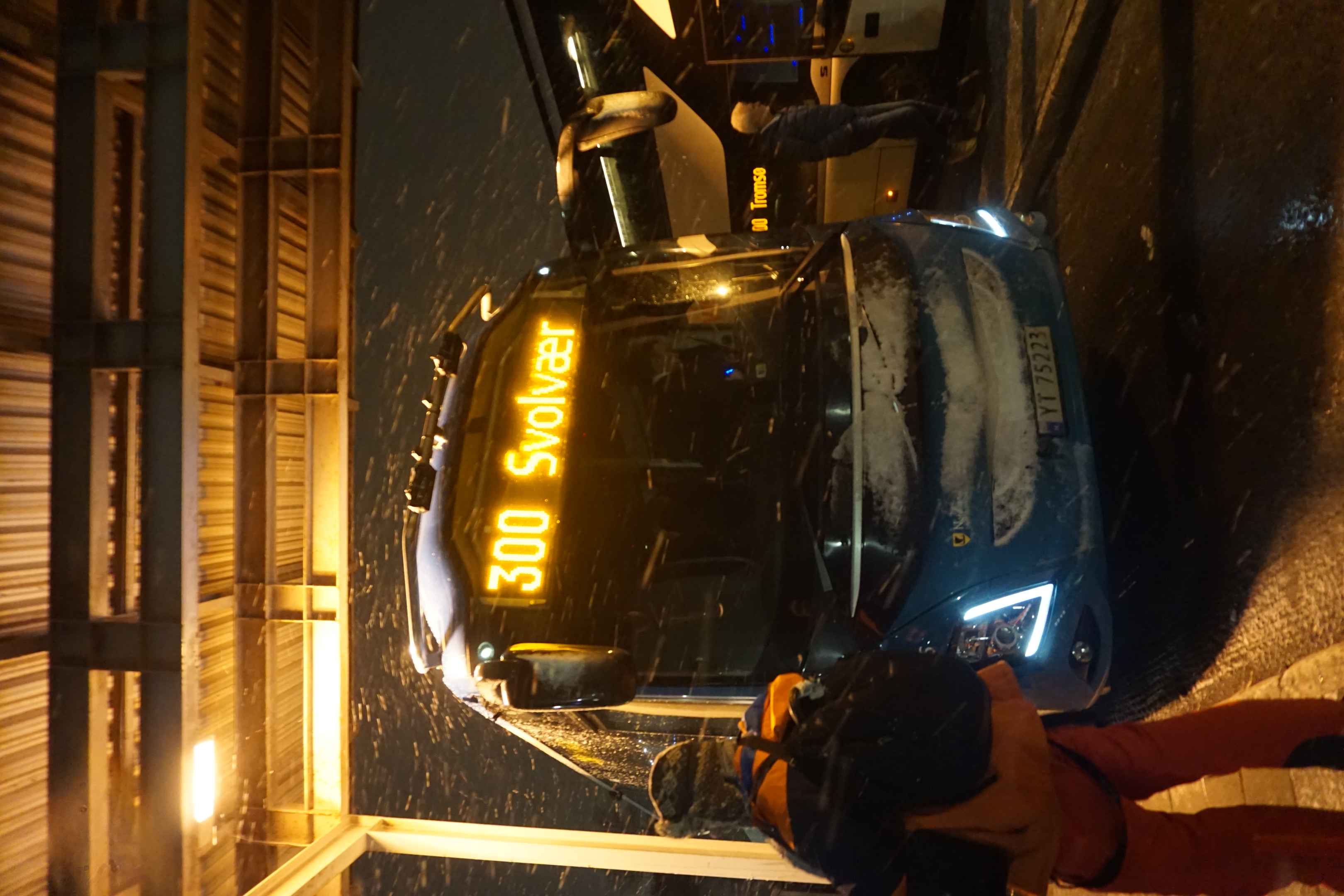 Am Nachmittag sind wir weiter auf die Lofoten gefahren. Der Bus Nr 300 fährt zwei mal täglich und verbindet Narvik mit den Lofoten. Nur ein paar Tage vorher gab es ein tödliches Busunglück. Durch den Schneeregen waren die Straßen glatt. Am beeindruckensten fand ich, dass die Strecke teils durch komplett vereiste Tunnel führt, welche unter dem Meer verlaufen und die einzige Verbindung zwischen einigen der Inseln darstellen. Der Busfahrer fuhr sehr vorsichtig und beendete die Fahrt aufgrund des Wetters vorzeitig in Svolvær.