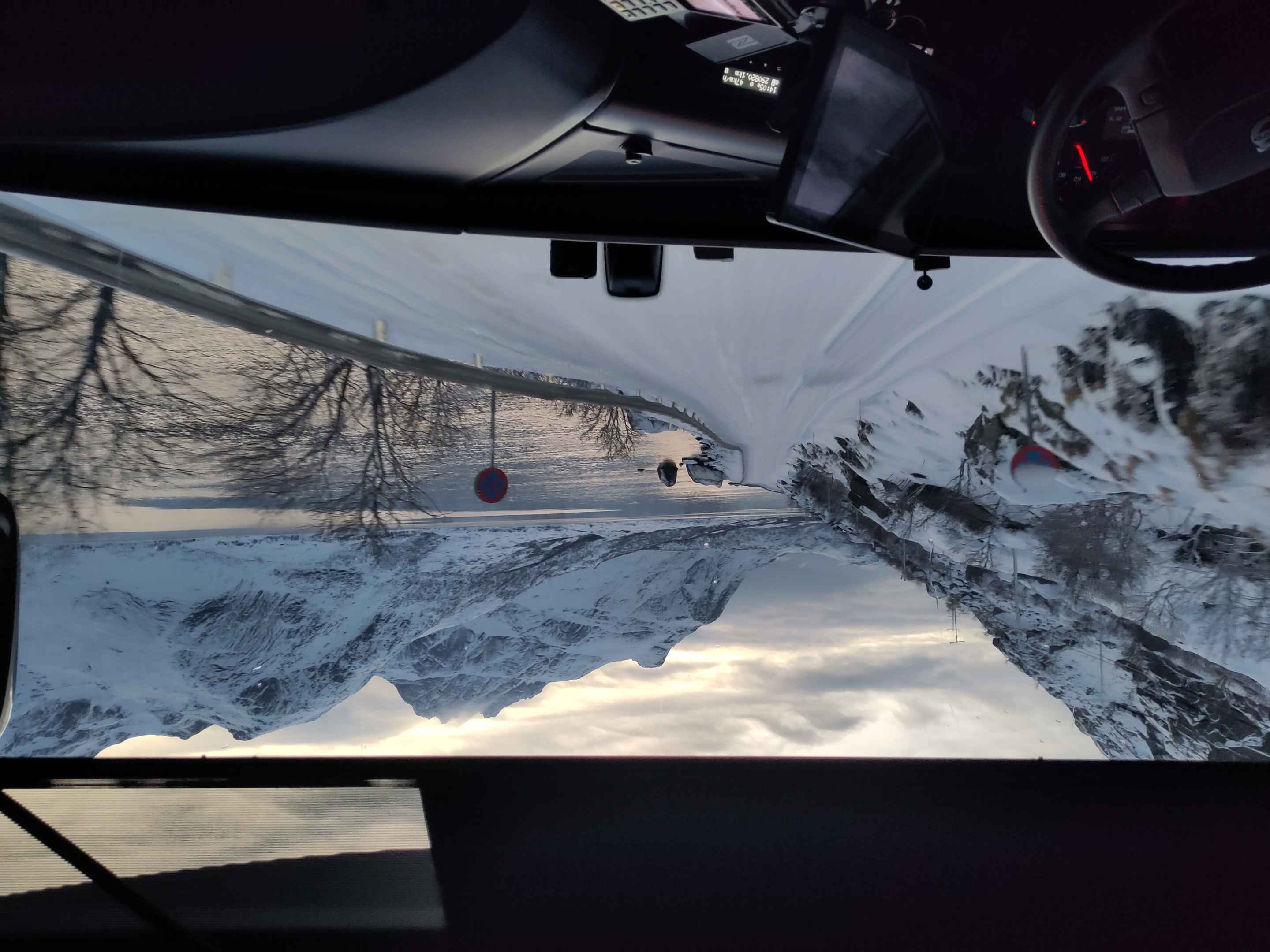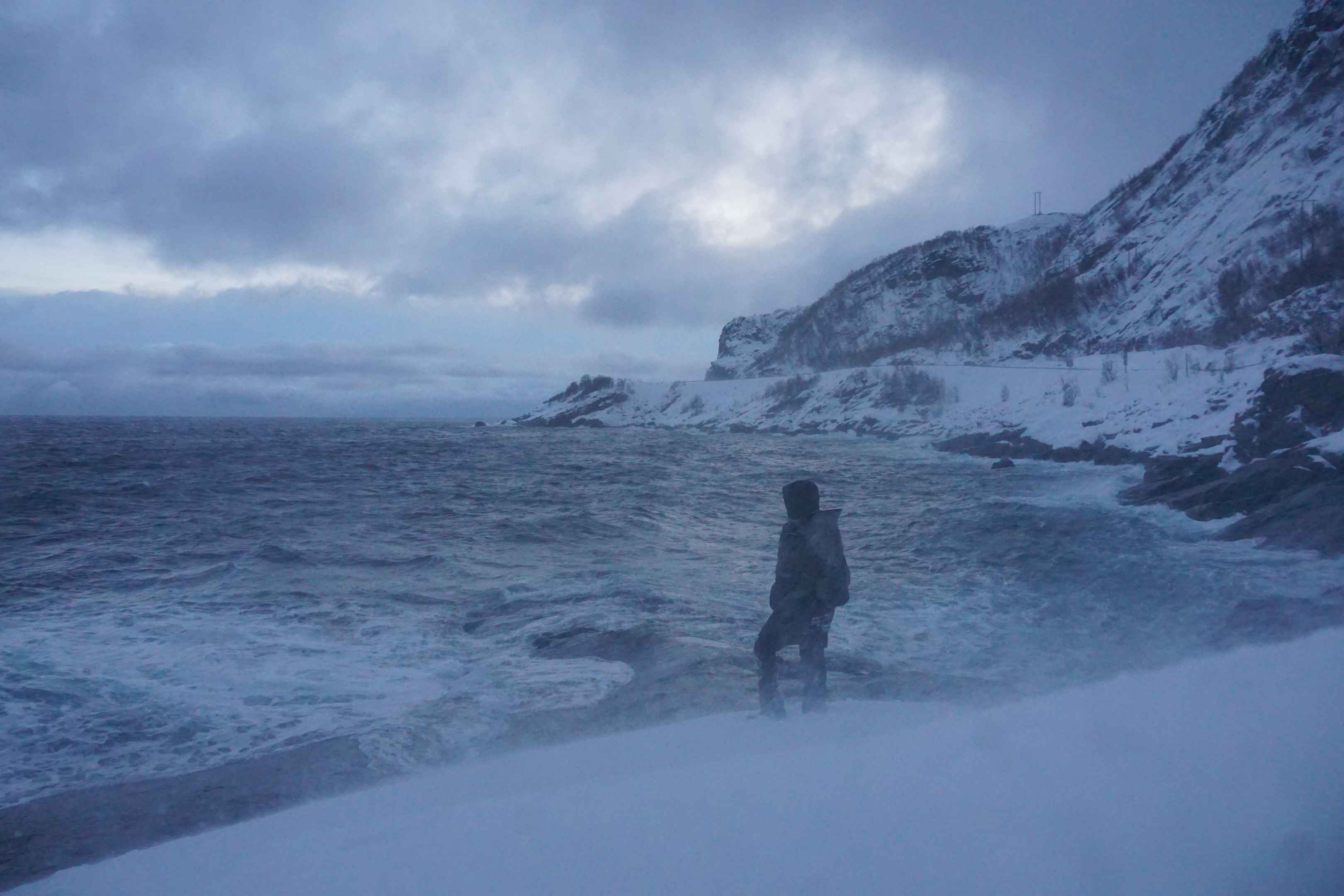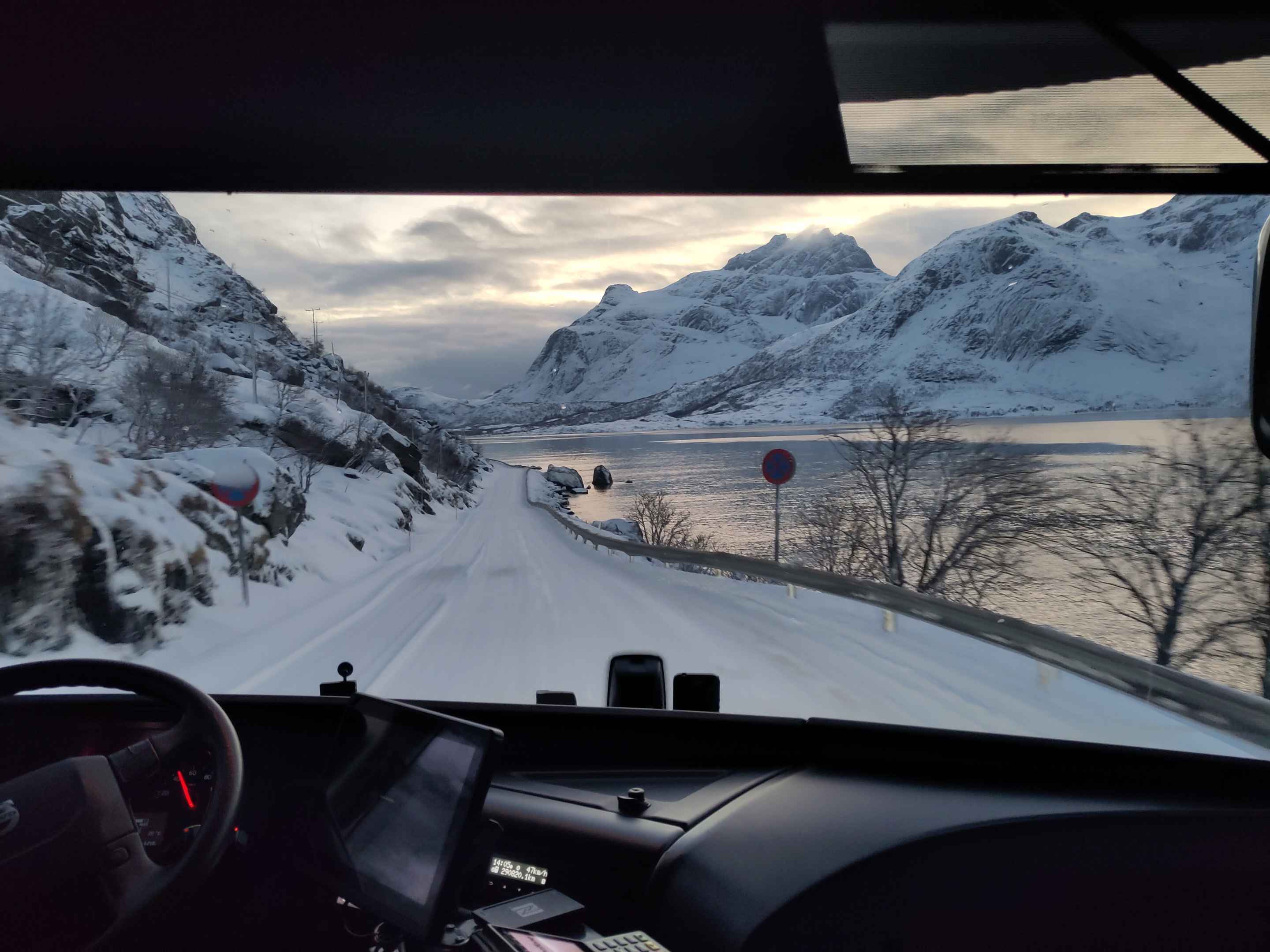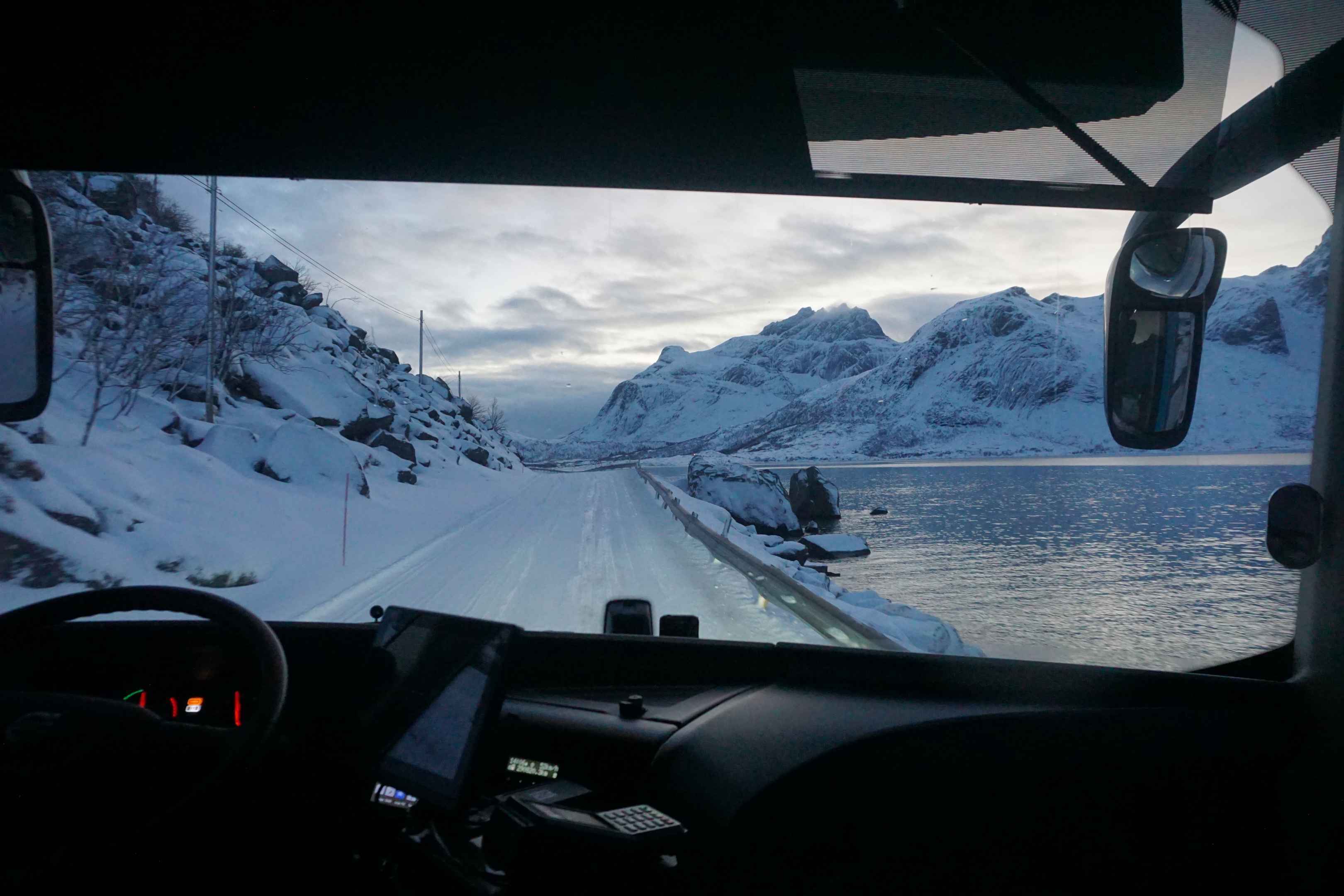 Die Straßen waren immer noch komplett vereist und der Bus kam während der Fahrt auch mal etwas ins Schlingern aber zum Glück bauten wir keinen Unfall. Auf der einen Seite befindet sich eine verschneite Berglandschaft, auf der anderen ein eisiger Ozean und die Straße schlängelt sich entlang des schmalen Küstenstreifens. Bei Gegenverkehr muss einer in einer Haltebucht warten oder rückwärts bis zur nächsten Haltebucht fahren.