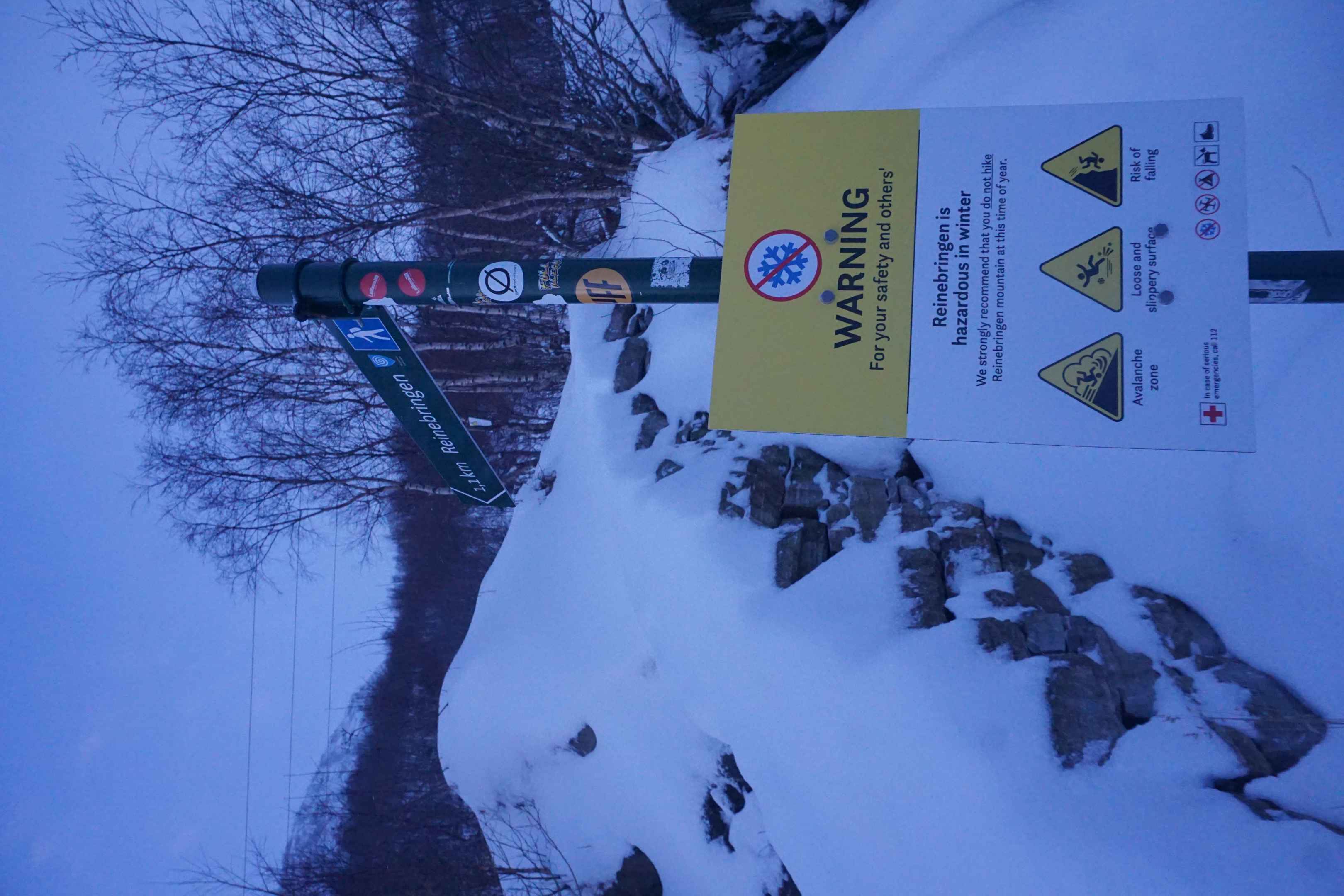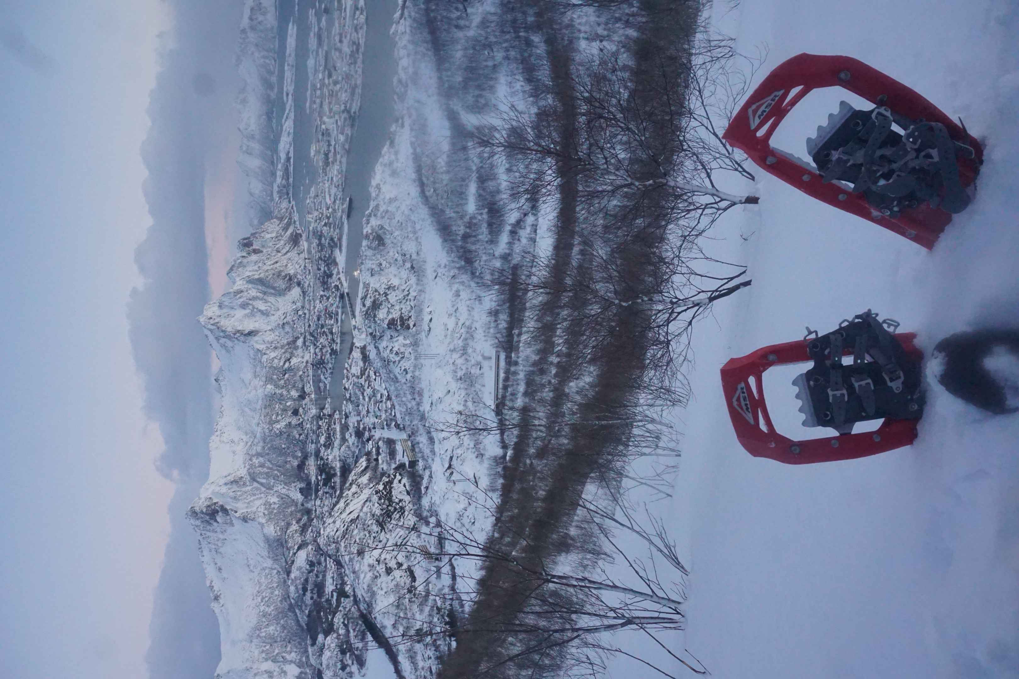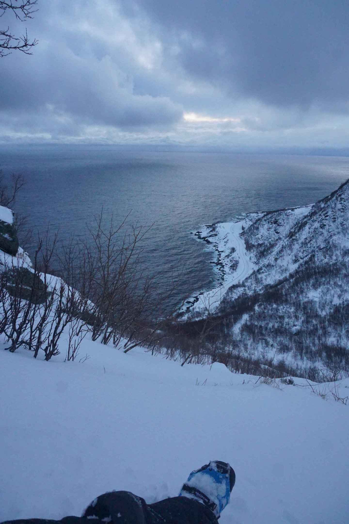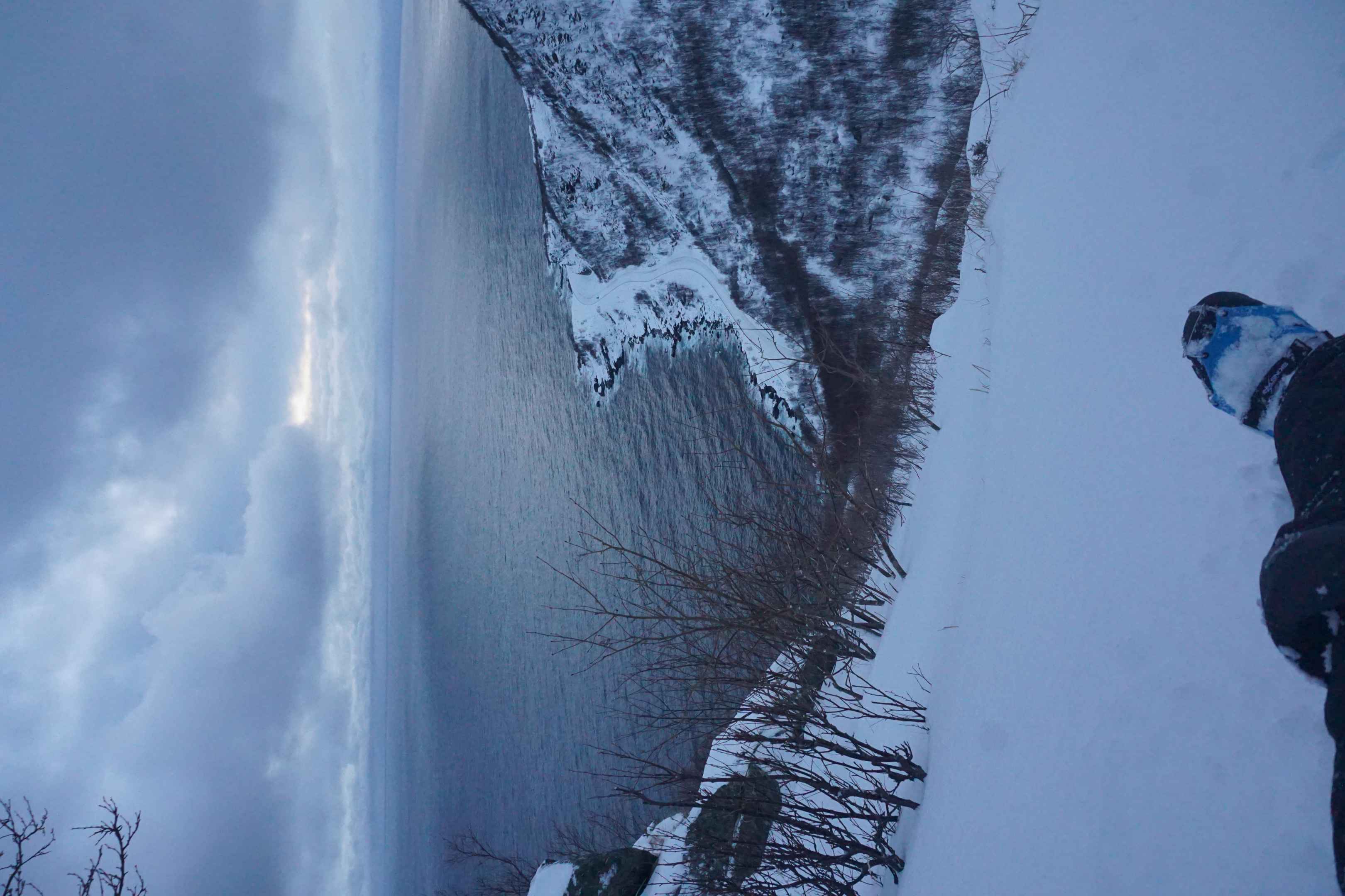 Am ersten Januar entschied ich mich, auf den Tjeldbergtind zu wandern, welcher angeblich einen guten Rundum-Ausblick bietet und auch im Winter bestiegen werden kann. Mit meinen Schneeschuhen machte ich mich von dem Aussichtspunkt aus, an welchem ich gestern die Polarlichter beobachtete, auf den Weg.