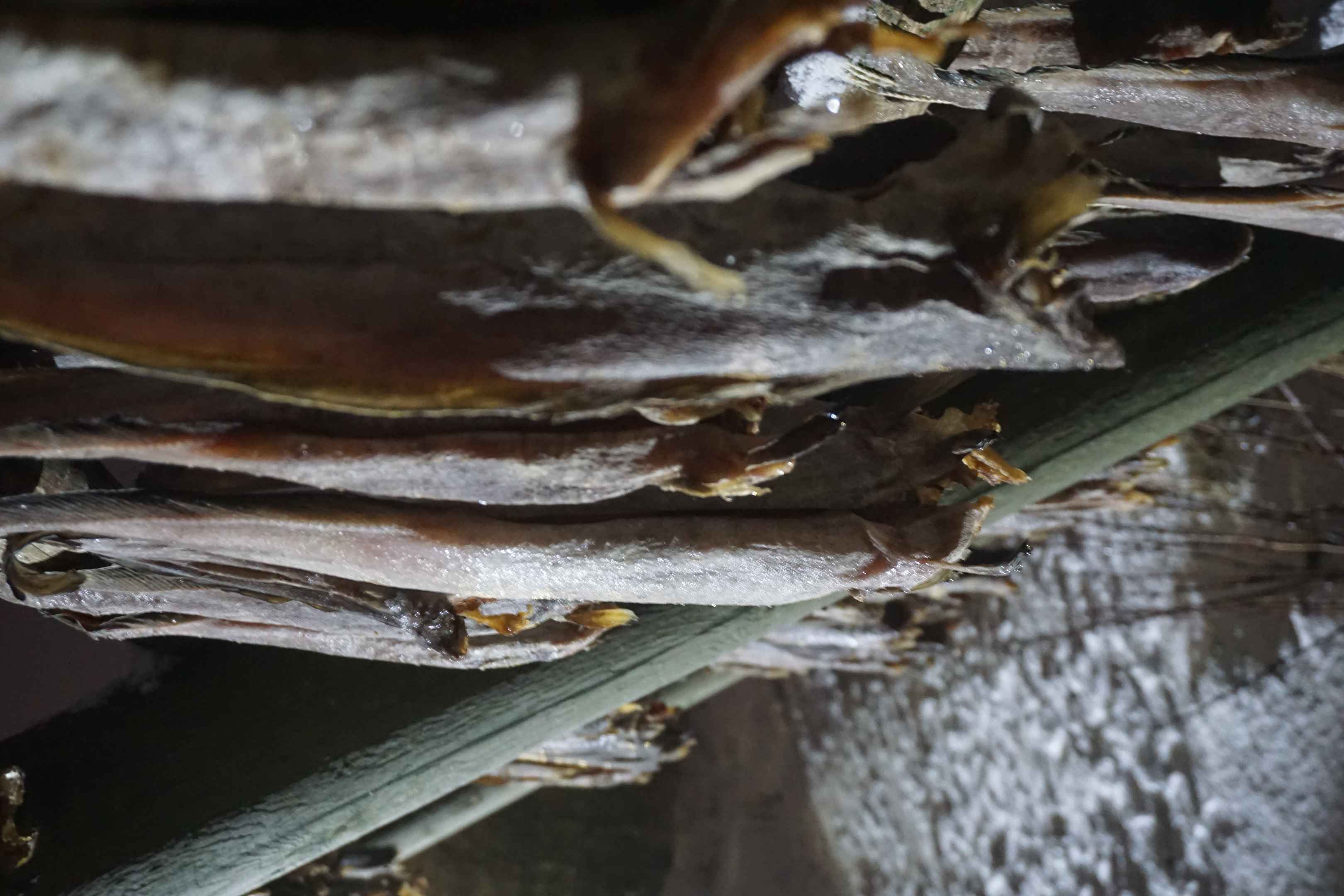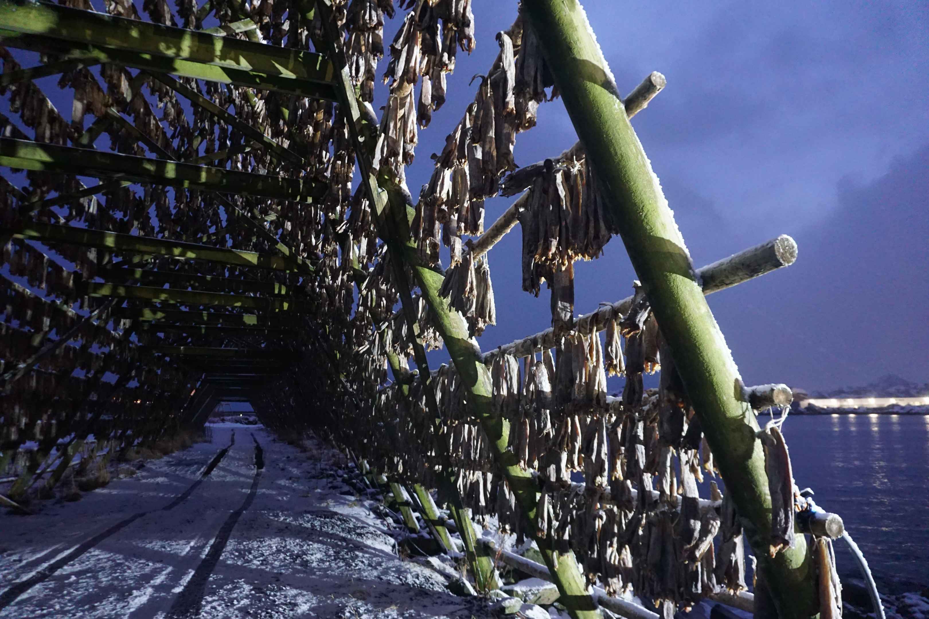 An den Holzgestellen werden Fische über den Winter zum Trocknen aufgehängt. Trotz der Minusgrade trocknen die Fische an der trockenen eisigen Luft durch Sublimation.