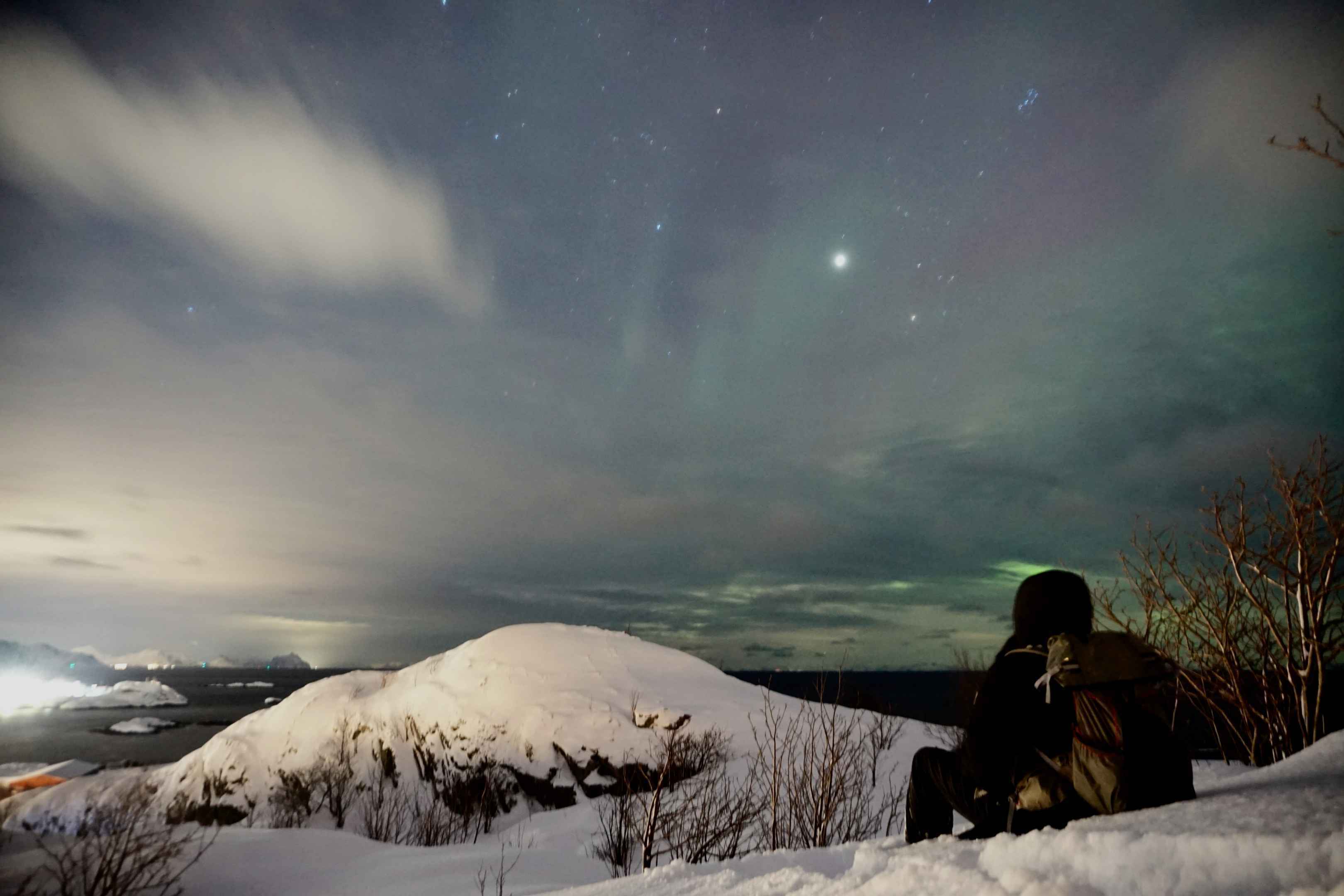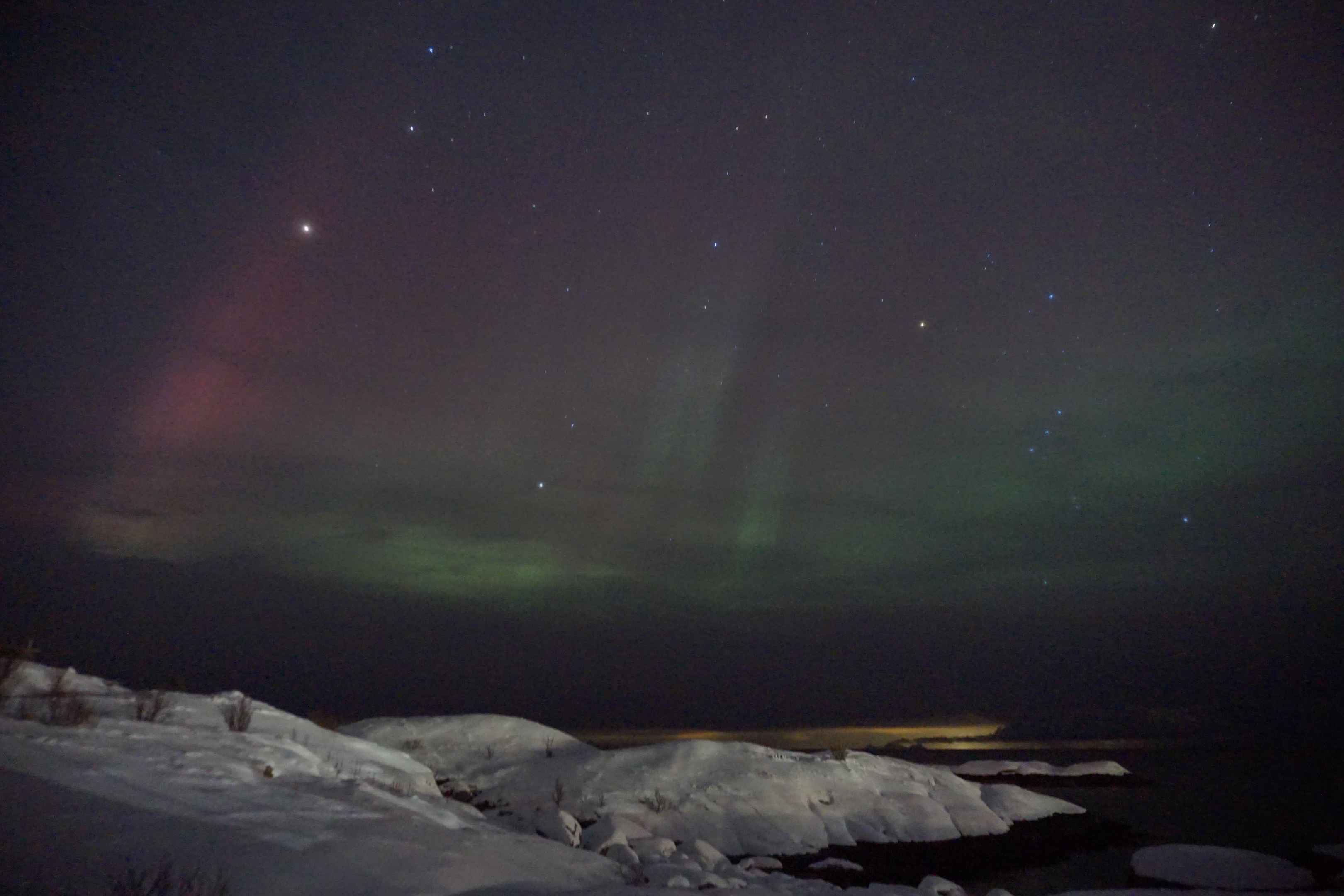 Als ich ankam, wurde es bereits dunkel und man konnte die ersten Polarlichter sehen. In echt sehen Polarlichter nicht so hell und farbig aus, wie auf Fotos. Man kann zwar die Farbe erkennen, es ist jedoch eher ein helles Leuchten und schwache Polarlichter sehen eher aus wie Wolken, nur bei starken Polarlichtern kann man die Farbe mit bloßem Auge sehen.