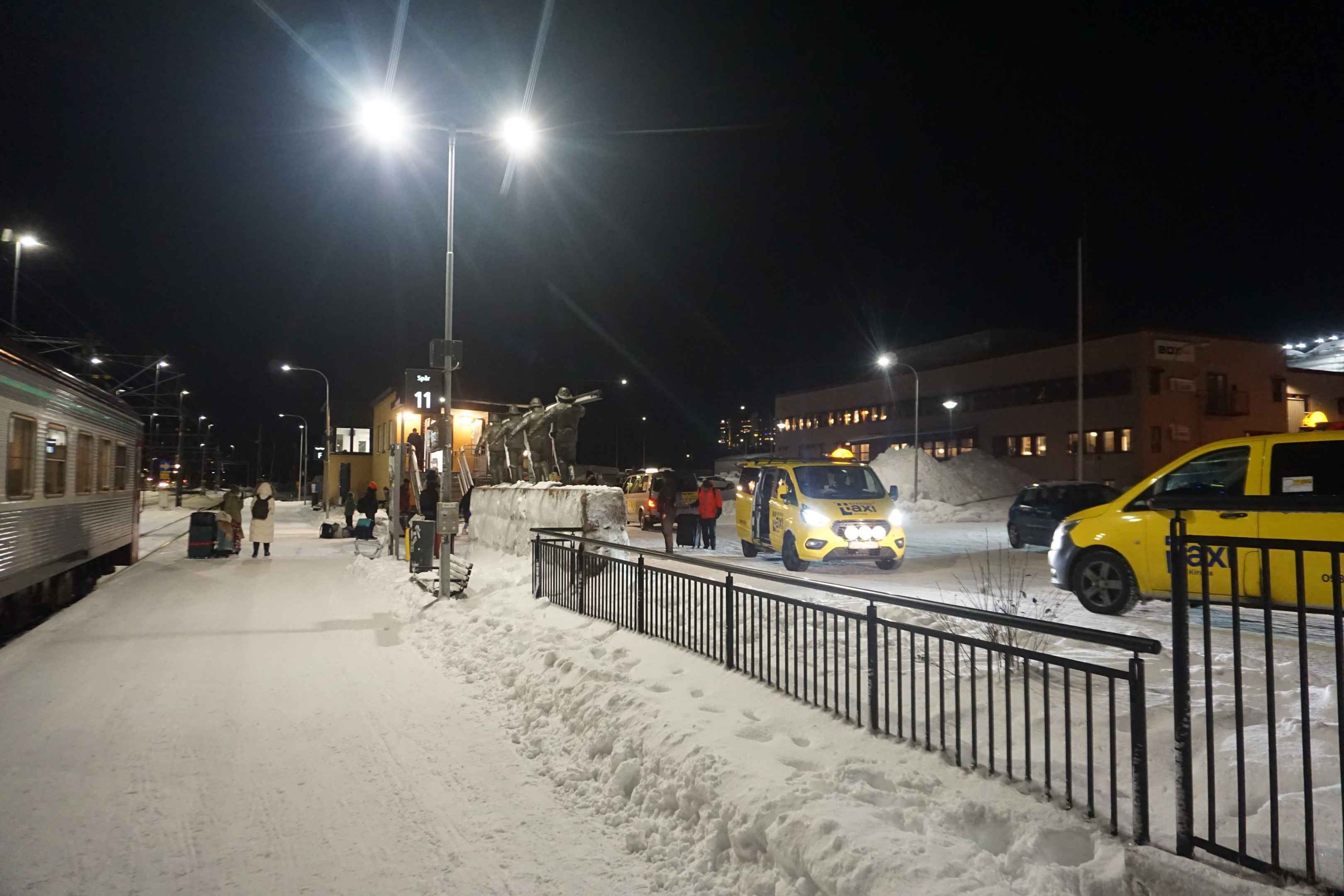 Nach der Hüttenwanderung in Lappland über Weihnachten sind wir zurück in Schweden, genau genommen in der Grenzstadt Haparanda-Tornio. Heute wollen wir mit dem Zug nach Narvik fahren. Öffentlicher Nahverkehr ist hier sehr schlecht ausgebaut, um in der Früh vom Hotel in der Innenstadt zum Bahnhof Haparande zu kommen, müssen wir ein Taxi nehmen. Wir fahren um 07:40 Uhr los und kommen dank der Zeitzonendifferenz um 06:50 Uhr am Bahnhof an. Der erste Zug führt uns bis nach Boden, dort steigen wir in den aus Stockholm kommenden Nachtzug nach Narvik um. Ein paar Tage vorher haben wir eine E-Mail von der Schwedischen Bahn bekommen, dass aufgrund der Witterungsverhältnisse der Zug nur bis Kiruna fährt und es keinen Schienenersatzverkehr geben wird aber uns wird für bis zu 2000 SEK pro Person ein Taxi bezahlt. Wir schreiben Taxi Kiruna und Taxi Narvik an. Aus Kiruna bekommen wir die Rückmeldung, dass sie keine freien Kapazitäten haben. Taxi Narvik bietet uns ein Taxi für 6000 SEK (umgerechnet 550 €) an. Nachdem alle Unterkünfte in Kiruna ausgebucht sind, ist das unsere einzige Option. Wir bekommen die Info, dass sie mit einem schwarzen Kleinbus kommen.