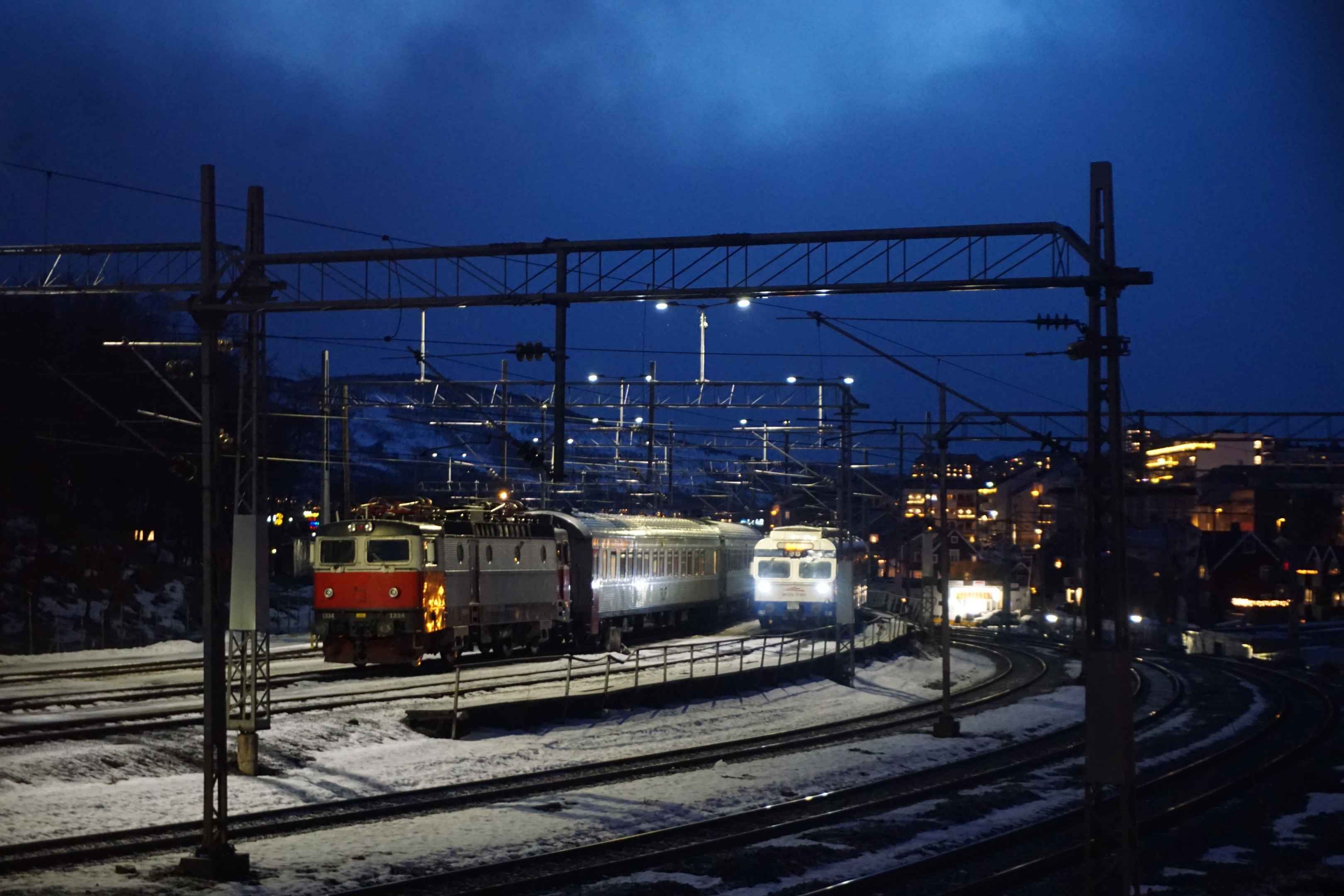 Nach gut zwei Stunden Fahrt über den vereisten Bergpass kommen wir in der Küstenstadt Narvik an. Ein Güterzug fährt im Bahnhof ein, diesen haben wir vorher in Kiruna losfahren sehen. Die Strecke ist zwar gesperrt, aber nicht für Güterzüge. Ein paar Personenzüge sind in Narvik gestrandet, diese werden für die nächsten paar Tage nicht von hier weg kommen.