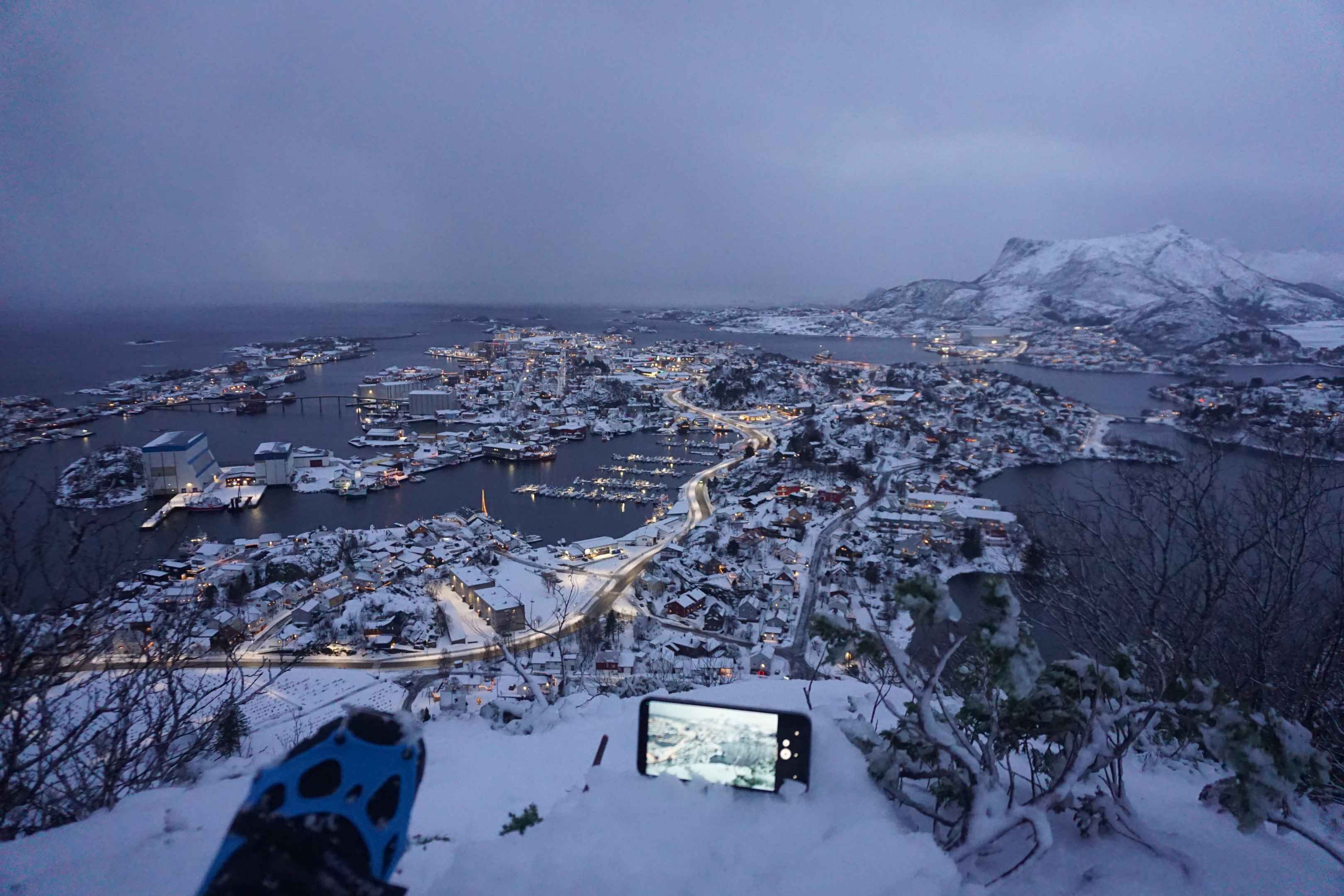 am Nachmittag bekam ich eine Benachrichtigung über die Polarlicht App, dass die Sonnenaktivität relativ stark ist und in etwa einer Stunde Polarlichter zu erwarten sind. Aufgrund der Richtungsvorhersage machte ich mich auf den weg zum Fjelltur, einen Aussichtspunkt im Südwesten der Stadt.