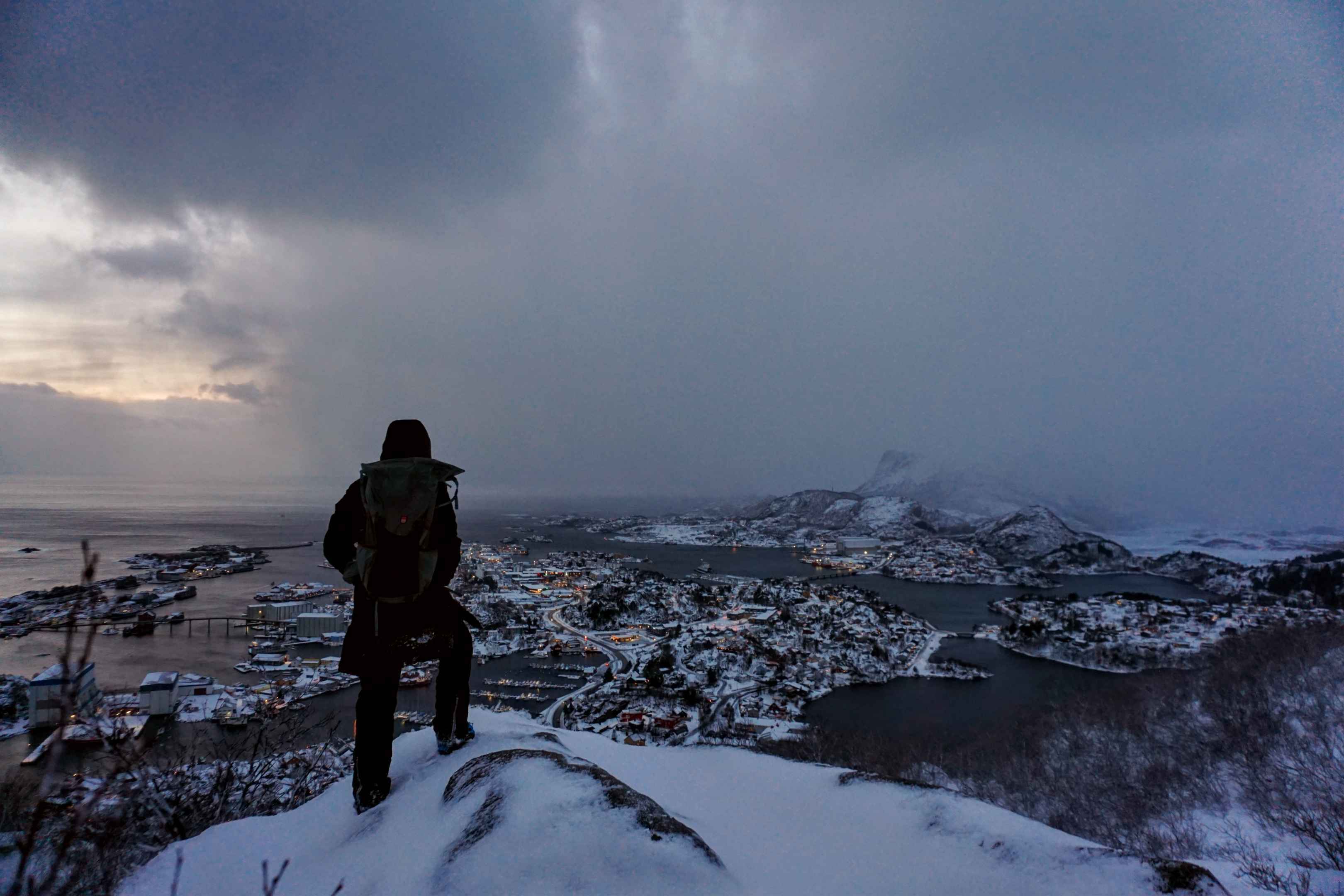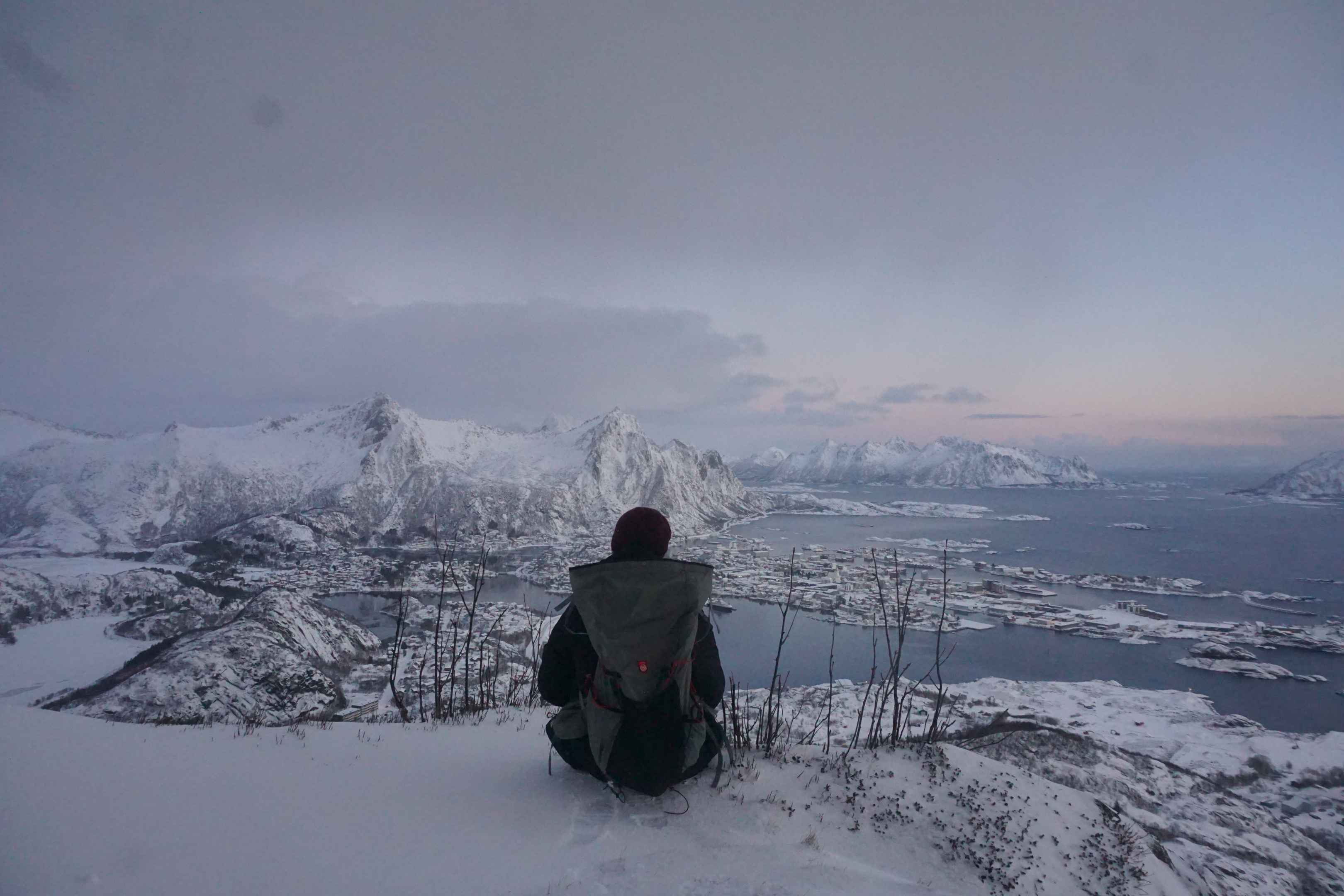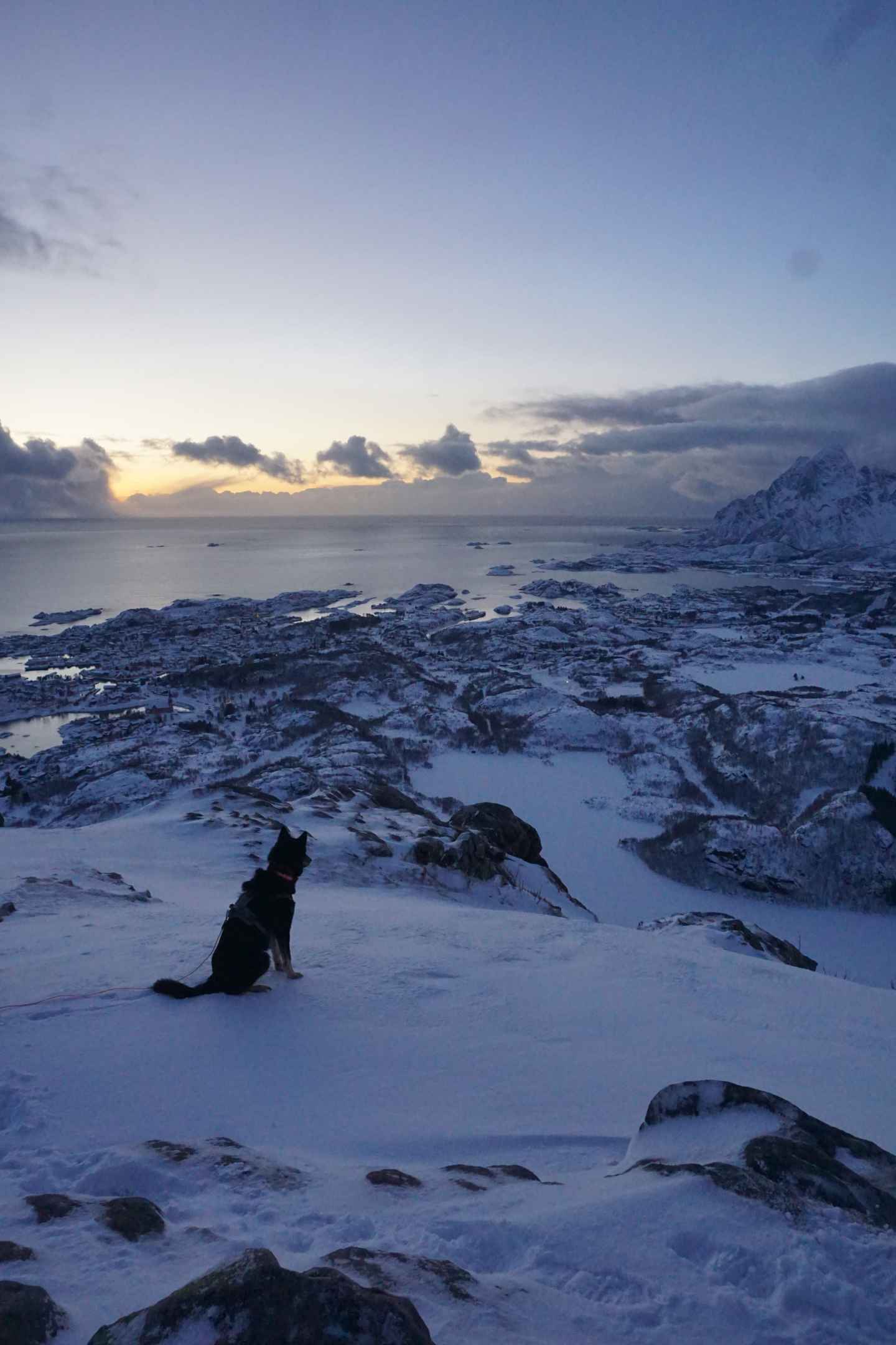 Oben traf ich noch zwei Wanderer, welche über die flachere Nordflanke aufgestiefen waren. Am Horizont konnte man fast schon die Sonne erahnen, welche es jedoch auch heute nicht über den Horizont schaffte. Unten an der zerklüfteten Küste konnte ich das Fischerdorf Kabelvåg erkennen.