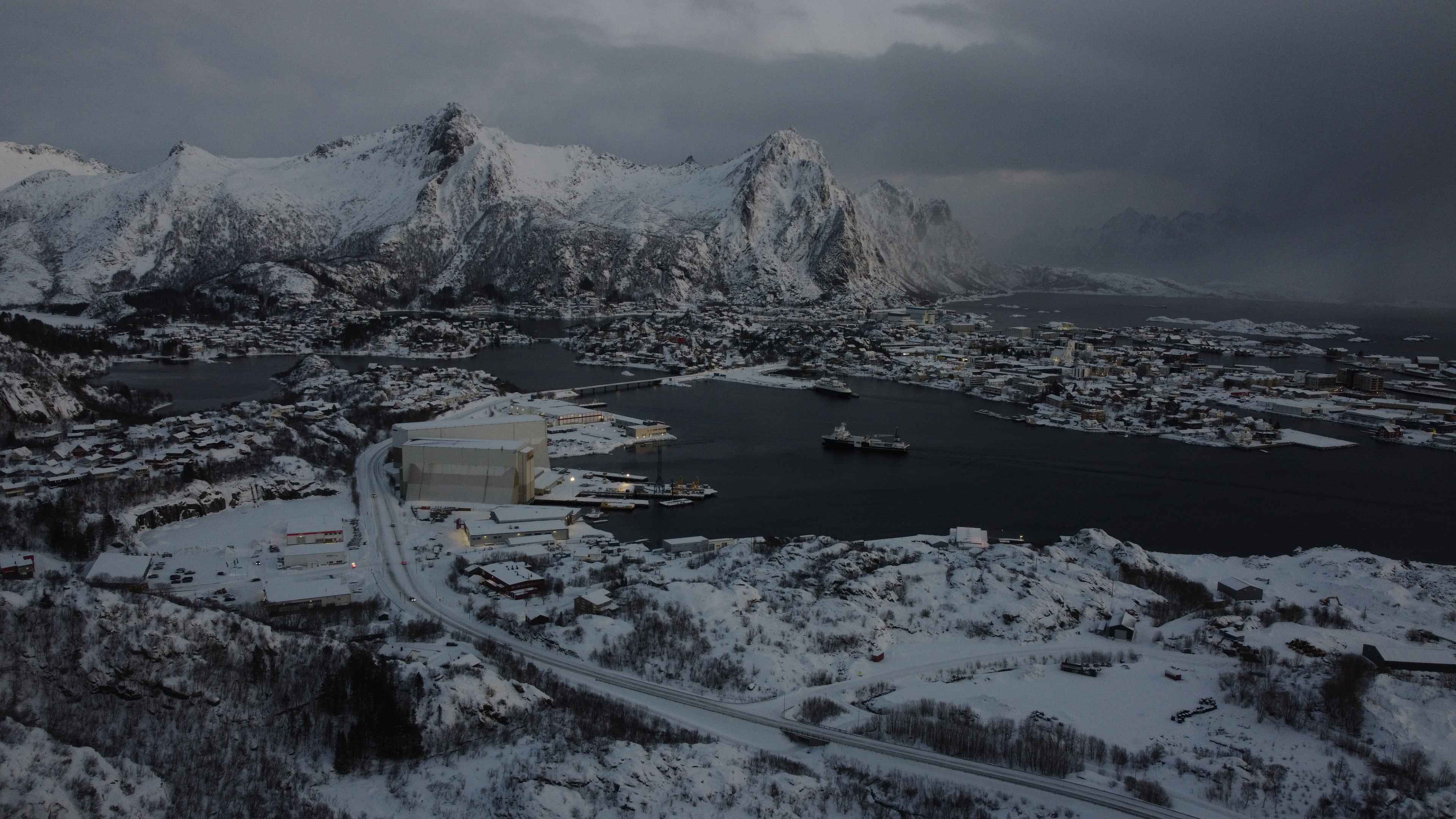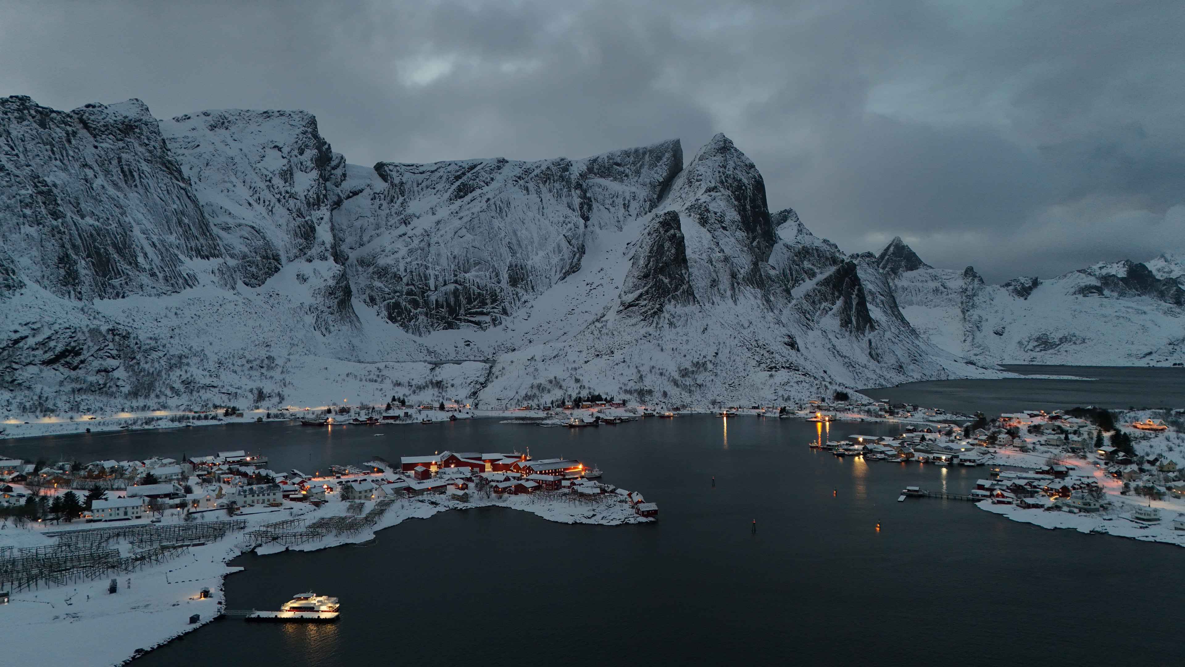 Reine vom Hafen aus – die Berge und das Dorf aus der Luft.