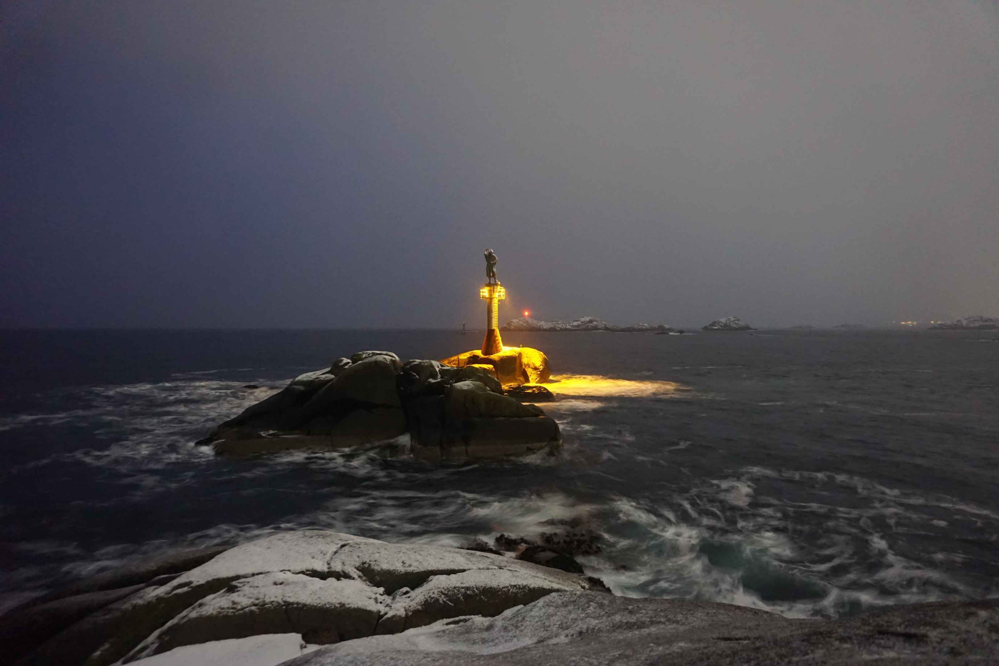 Ganz am südlichen Ende der Insel befindet sich ein künstlicher Wellenbrecher und davor auf einem Felsen eine mit gelben Natriumdampflampen beleuchtete Statue. Die Stadte hat übersetzt den Namen "Des Fischers Frau" und schaut mit eisernem Blick hinaus aufs offene Meer.