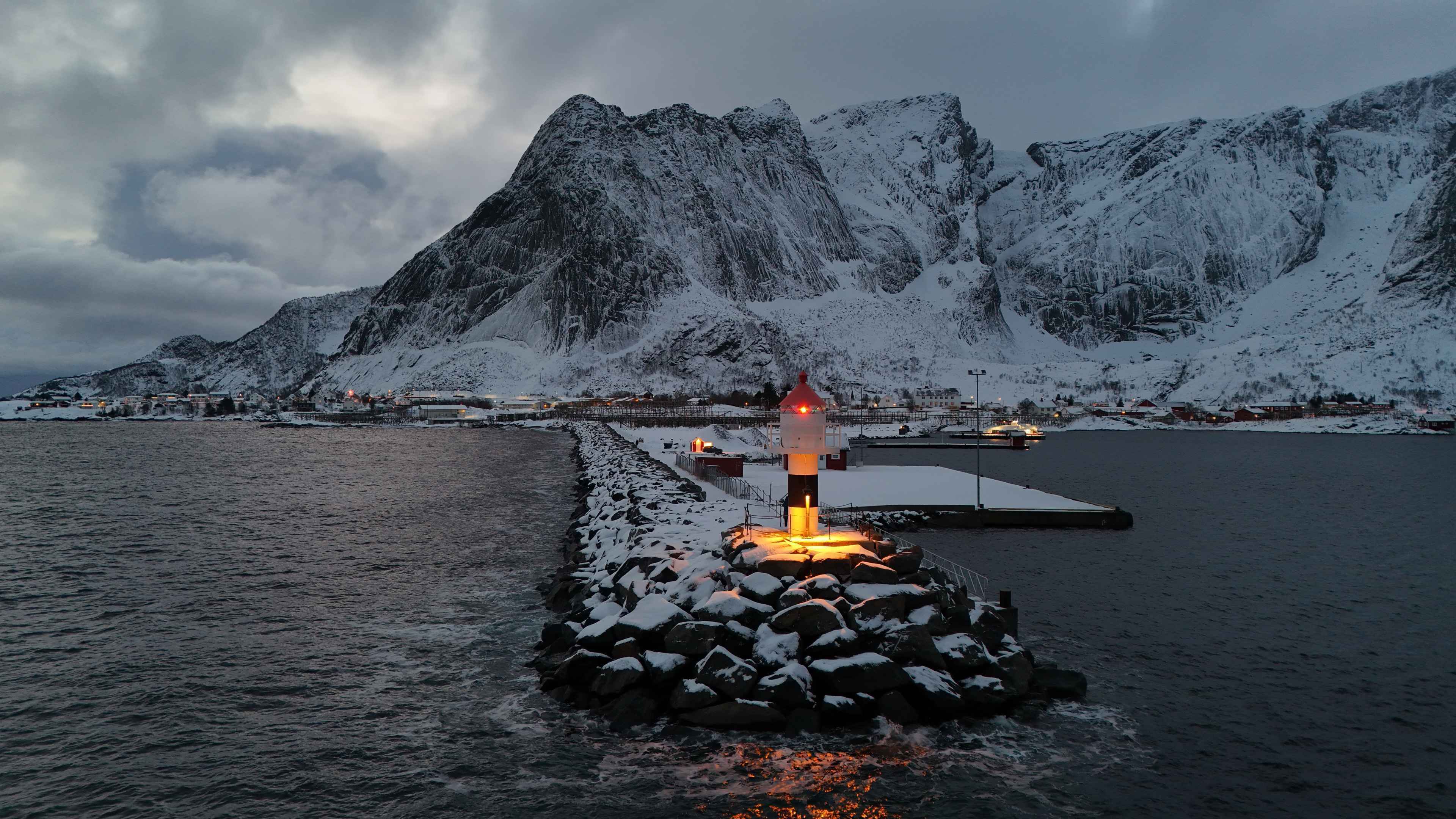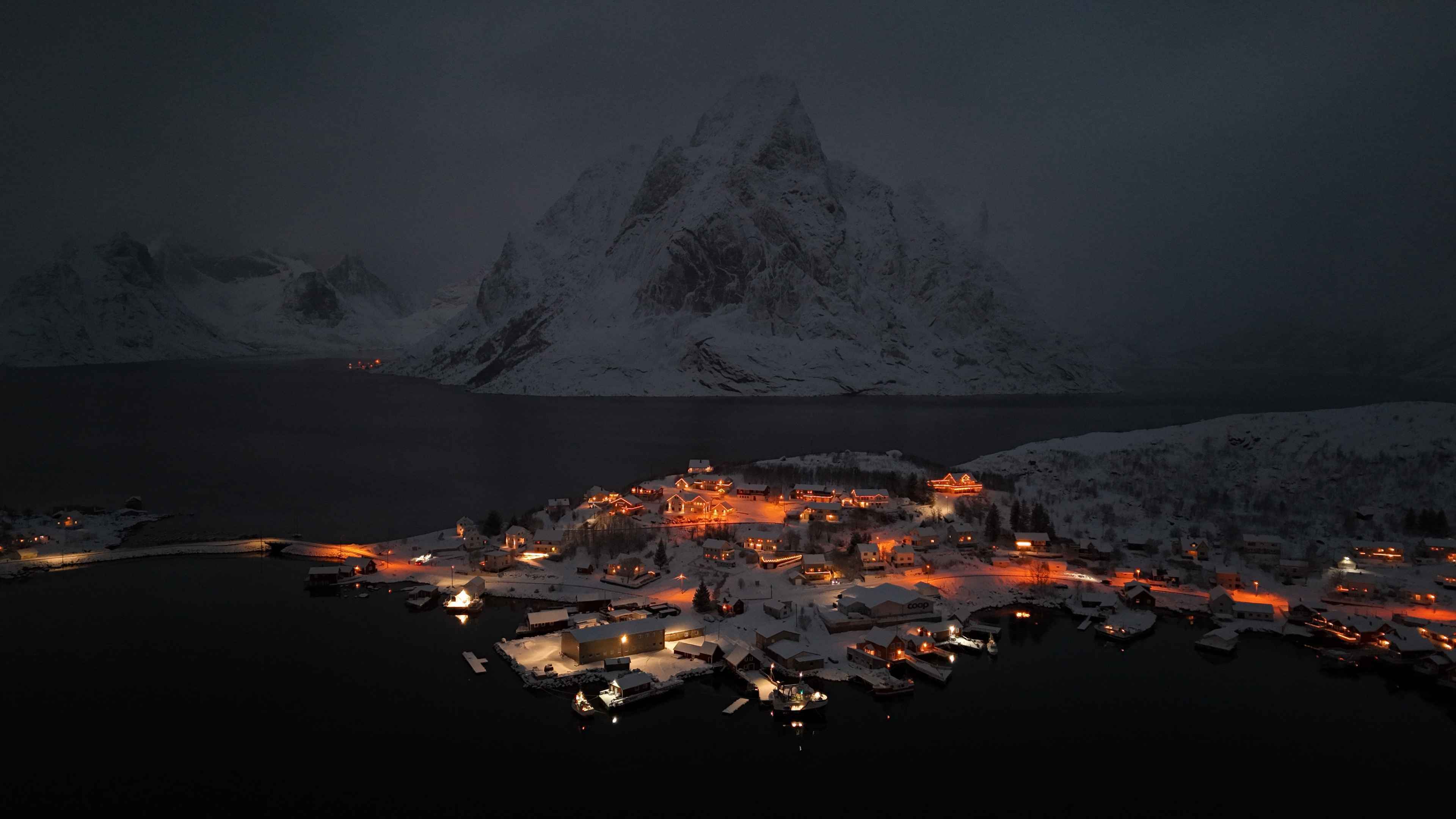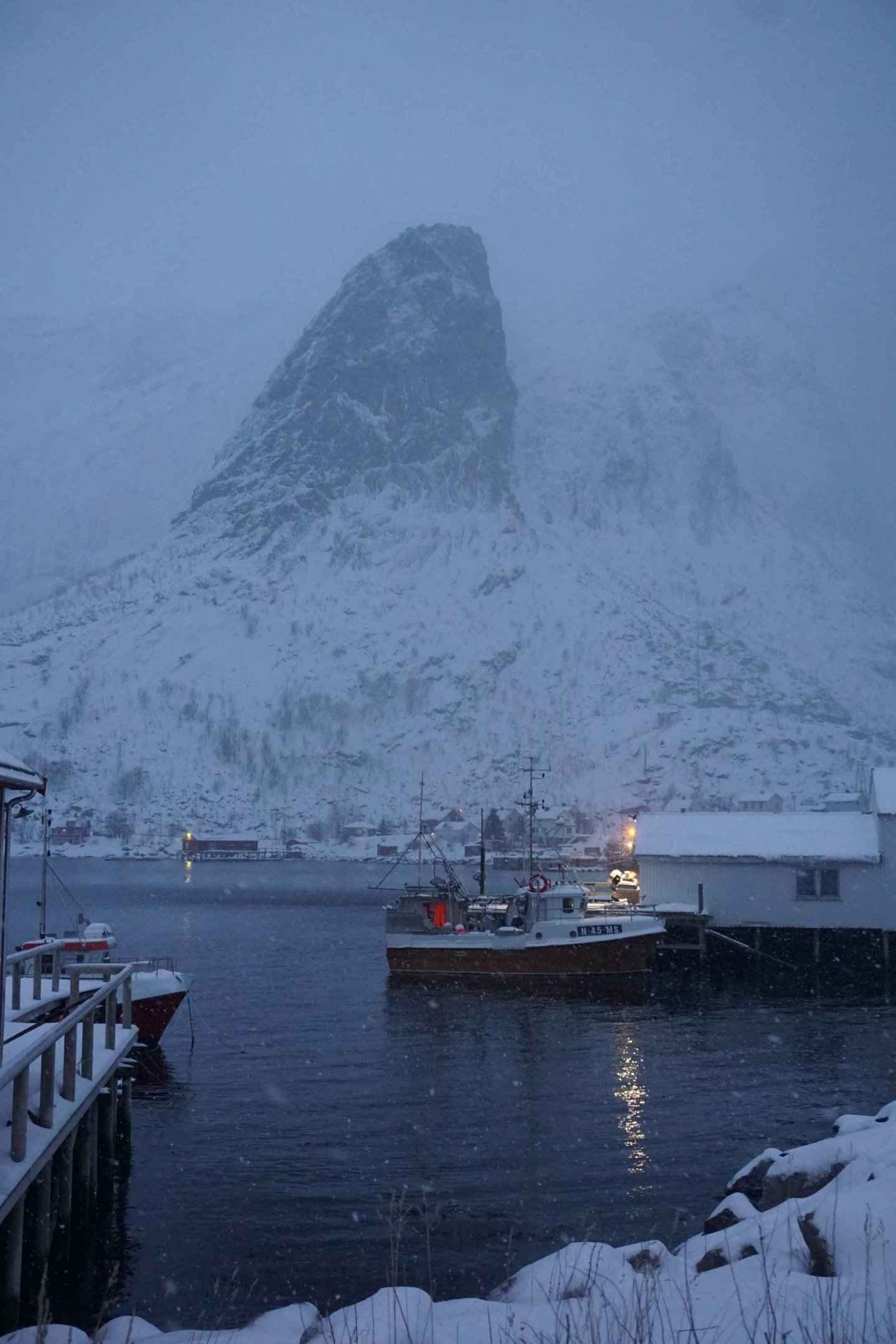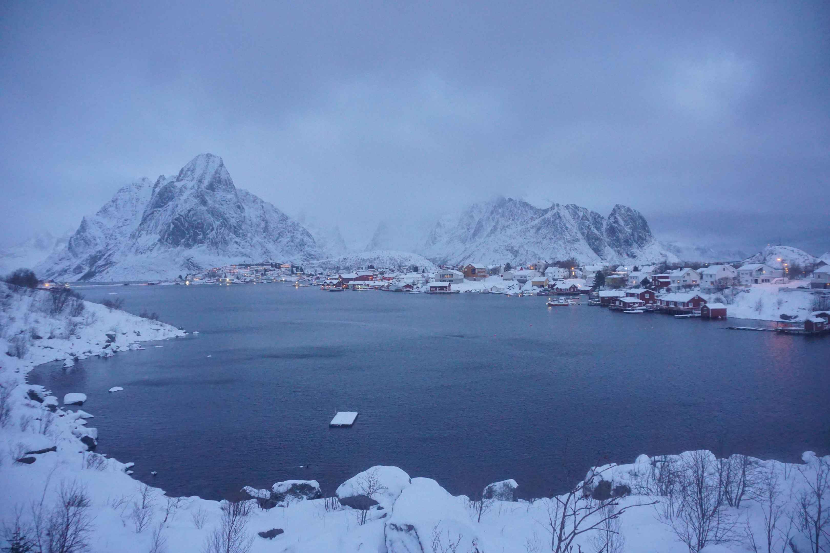 Reine bei Dunkelheit – Lichter und Silhouetten am Fjord.