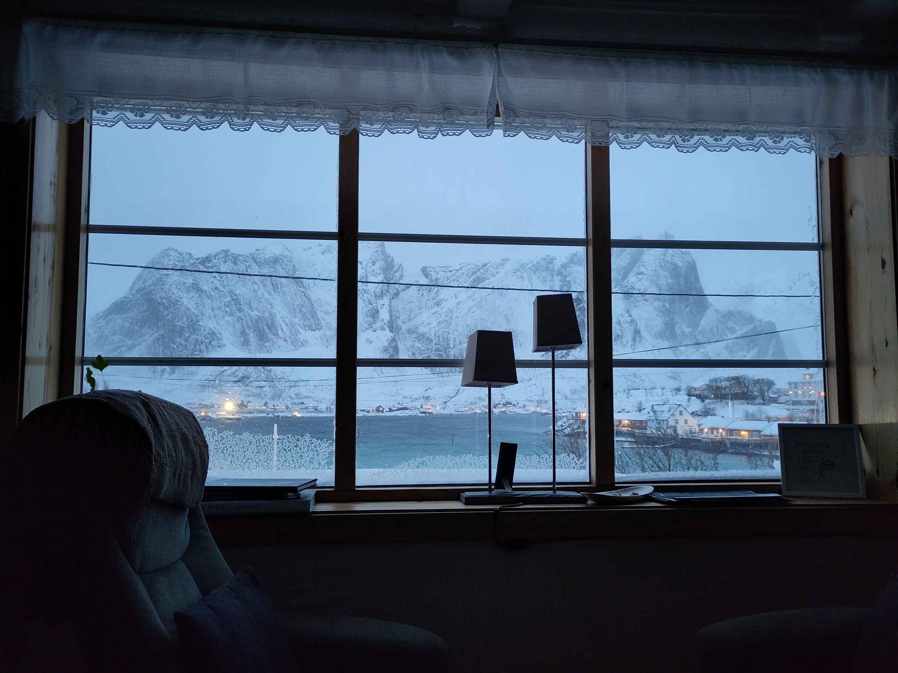 Vom Wohnzimmer des Hostels aus hatten wir einen fantastischen Blick auf den Fjord mit dem Dorf und den Bergen im Hintergrund.