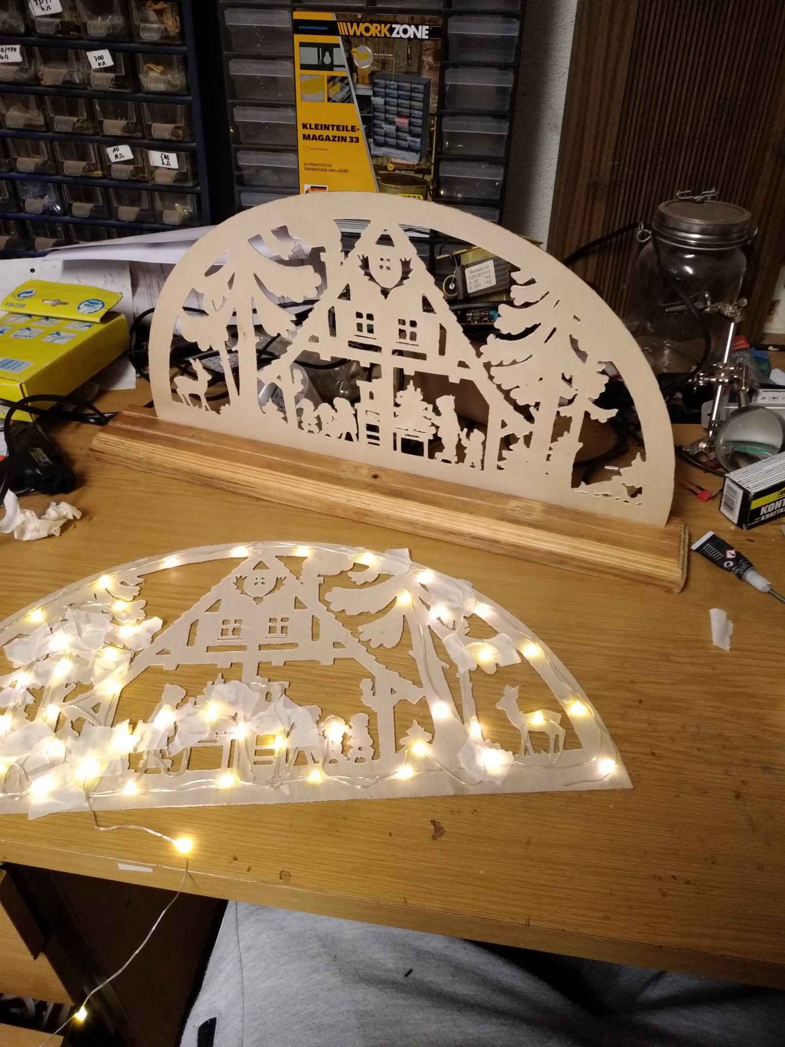 Mit der Dekupiersäge habe ich dann grob den Schwibbogen aus den beiden 2mm dünnen Spanplatten ausgesägt. Anschließend habe ich mit einem 1mm Bohrer auf der Standbohrmaschine auf höchster Drehzahl alle feineren Konturen und Details ausgeschnitten, ähnlich wie mit einer Fräse.