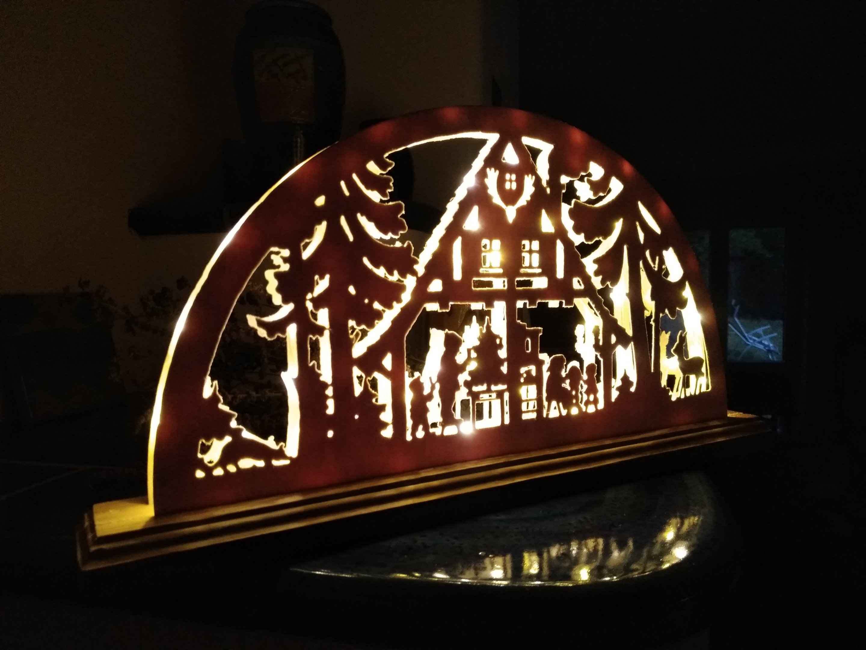 Der fertige Schwibbogen hat schließlich auf dem Kachelofen seinen Platz gefunden und sorgt für eine gemütliche weihnachtliche Atmosphäre im Haus.