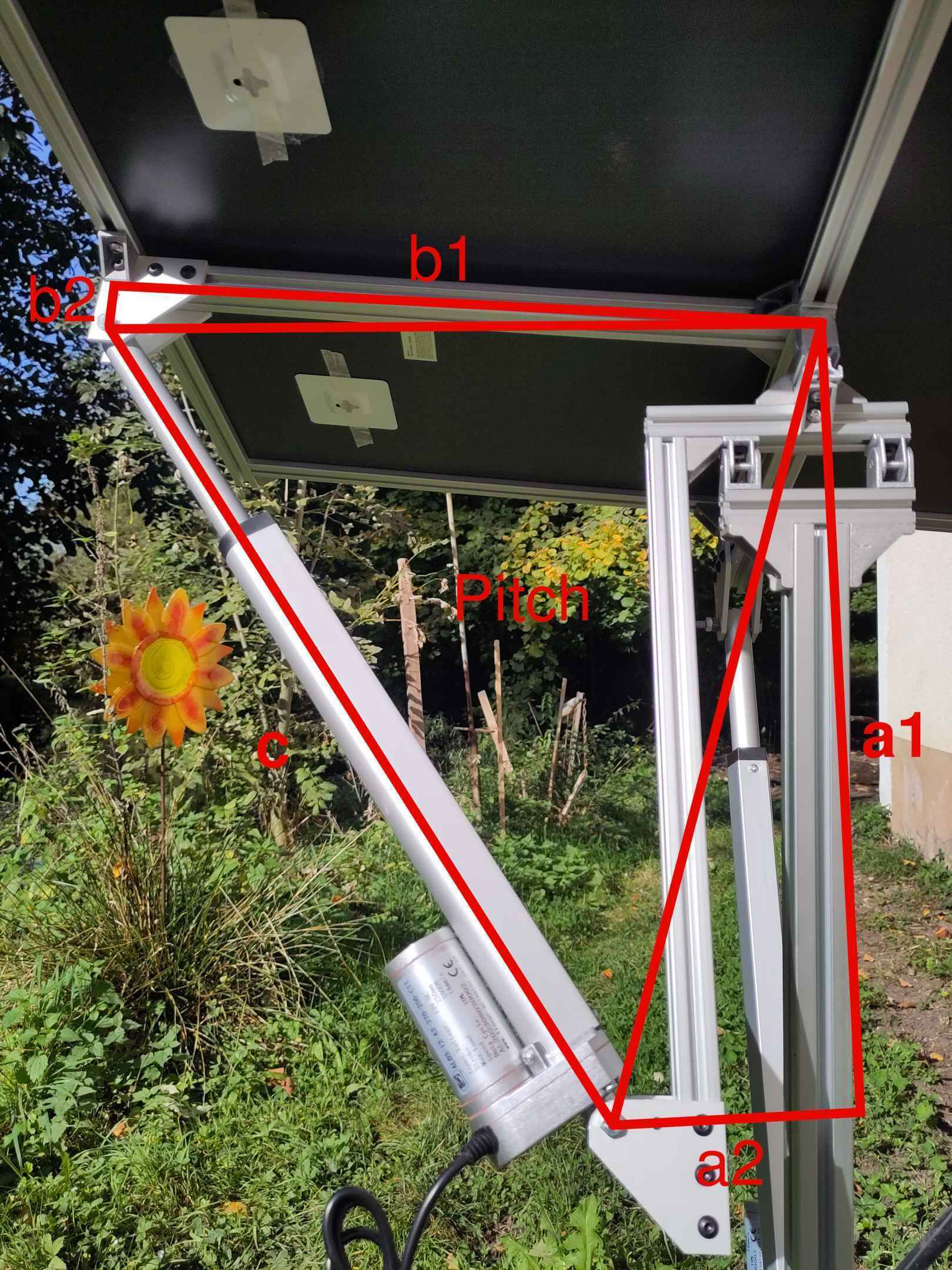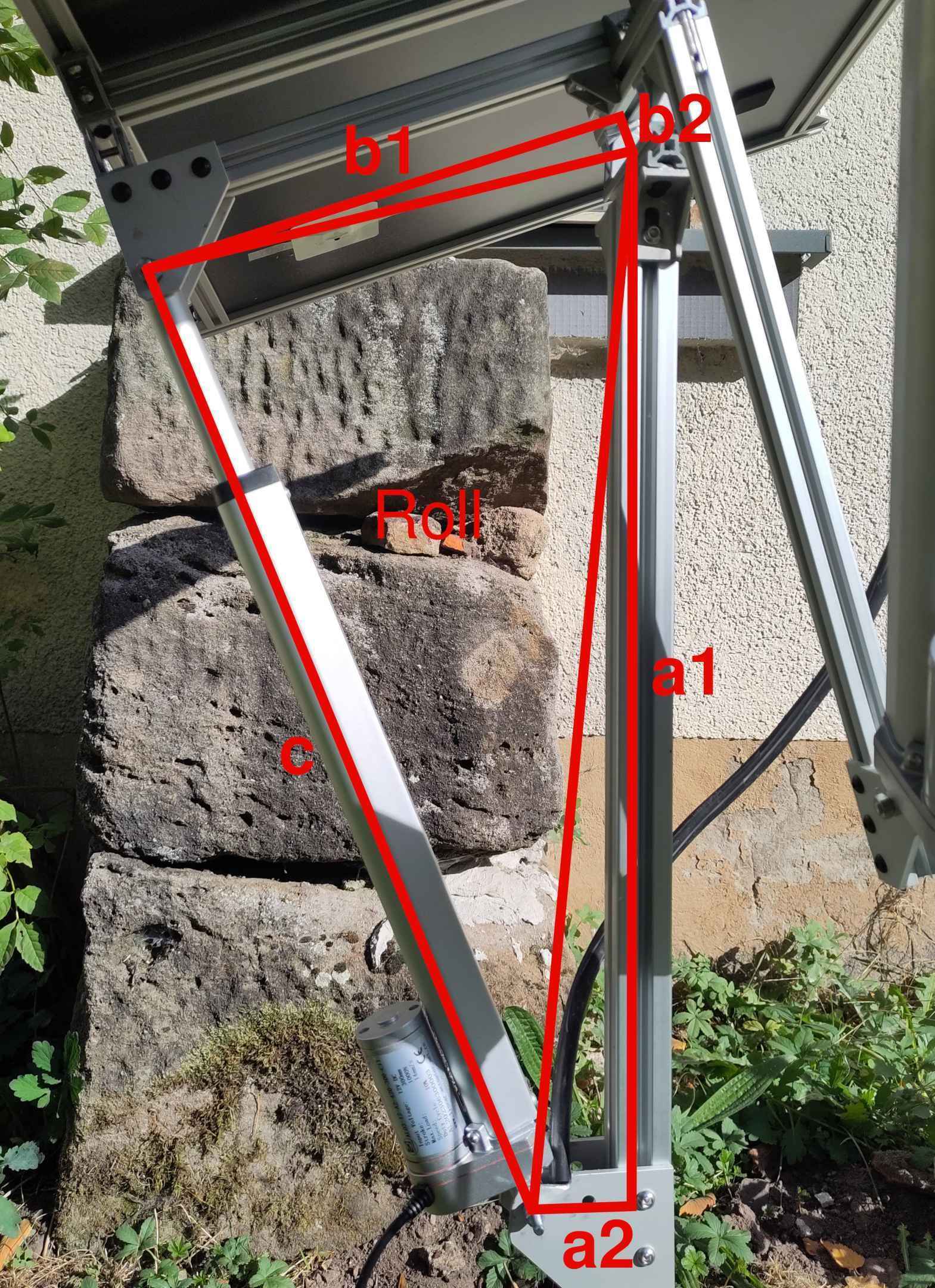 Nun zur Ansteuerung. Die beiden Motoren liegen Orthogonal zueinander. Die günstigste und einfachste Variante ist es, einen Motor am Masten zu befestigen. Dieser steuert die Roll-Achse. D. h. Wenn man von Süden auf den Siegel schaut, das "Kippen" nach Links und Rechts. Der Motor bildet ein Dreieck mit den Seitenlängen a, b, und c. Aus den fixen Längen a1 und a2 bzw. b1 und b2 lassen sich die Seiten a und b bestimmen. Wenn man nun den Winkel an einen bestimmen Winkel platzieren möchte, zieht man erst die Winkel der Dreiecke A und B ab und berechnet anschließend die Seitenlänge c. Das selbe gilt für den Motor in Pitch-Richtung. Dieser ist so montiert, dass er sich in Roll-Richtung mitdreht. Das vereinfacht die Mechanik der Gelenke an denen er befestigt ist und die Software zum Umrechnen der Winkel. Der Solartracker funktioniert folgendermaßen: