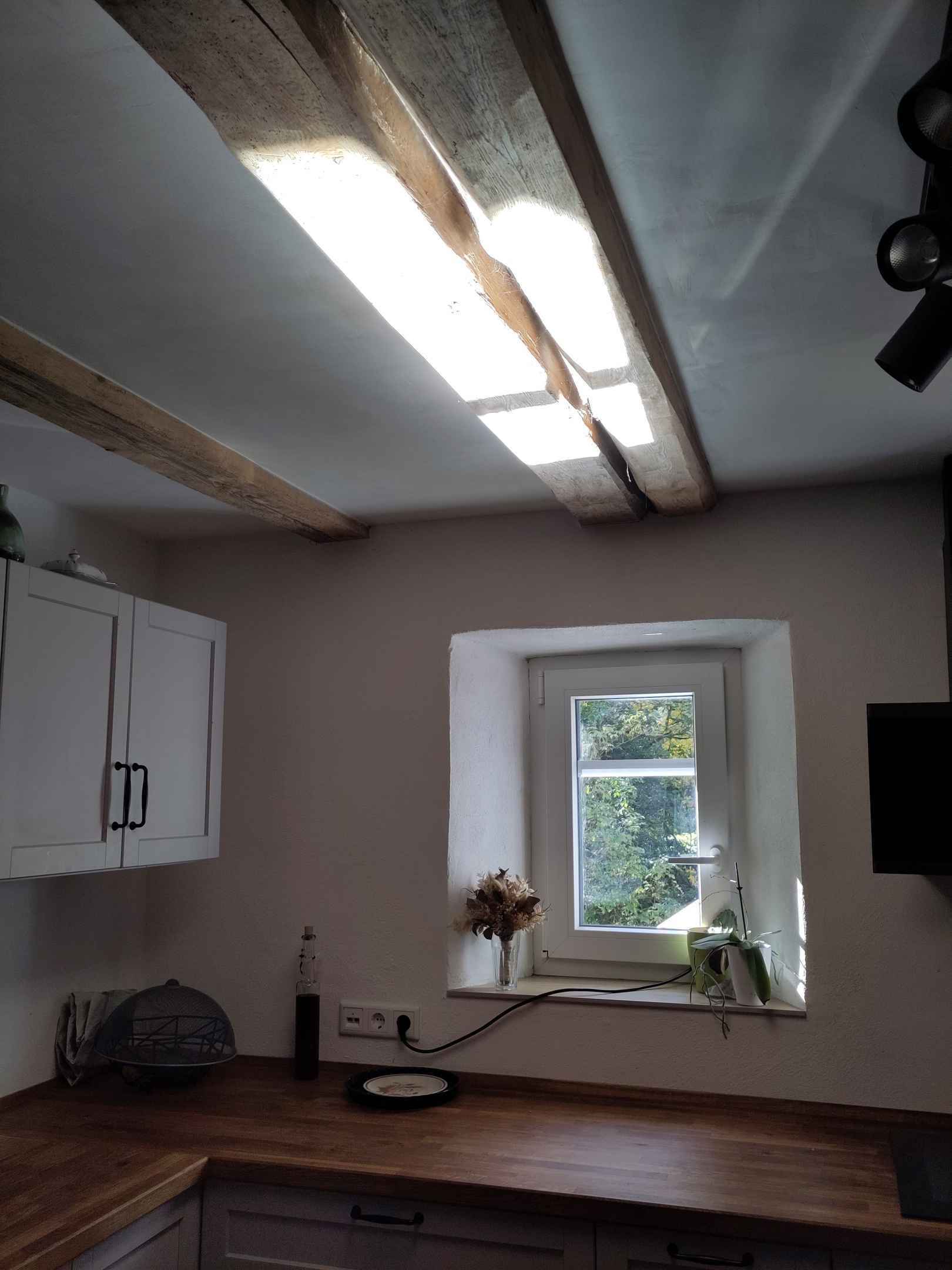 Dank des neuen Reflektors im Garten kommt nun doppelt so viel Licht durch das kleine Küchenfenster, jedoch nur bei direkter Sonneneinstrahlung. Wenn man nicht da ist, kann man den Spiegel ausschalten, damit sich die Wohnung nicht zu sehr aufheizt.