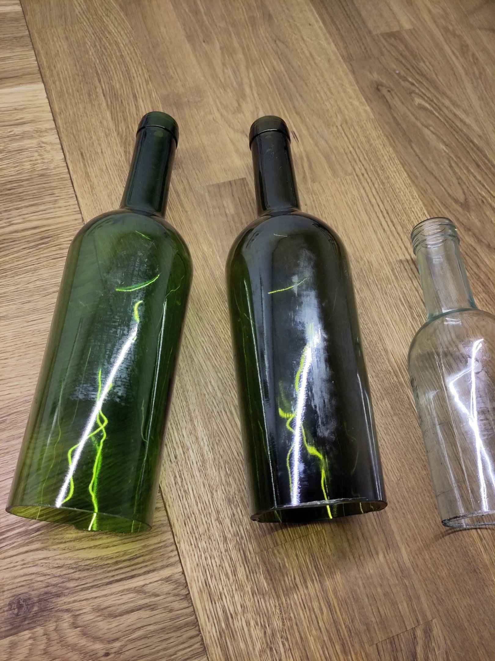 Als Erstes habe ich eine Weinflasche auf den Glasflaschenschneider platziert und mit mäßigem Druck gerollt, um eine tiefe Kerbe im Glas zu erzeugen. Dabei trug ich natürlich meine Sicherheitshandschuhe, um mich vor Verletzungen zu schützen. Anschließend habe ich einen Wollfaden in Wachs getränkt und um die Kerbe gewickelt. Dann erhitzte ich die Flasche entlang der Kerbe über einer Kerze, während ich sie ständig rollte. Sobald ich die gewünschte Bruchstelle erreicht hatte, schreckte ich die Flasche vorsichtig in kaltem Wasser ab. Falls die Flasche nicht sauber in zwei Teile brach, habe ich den Vorgang wiederholt.